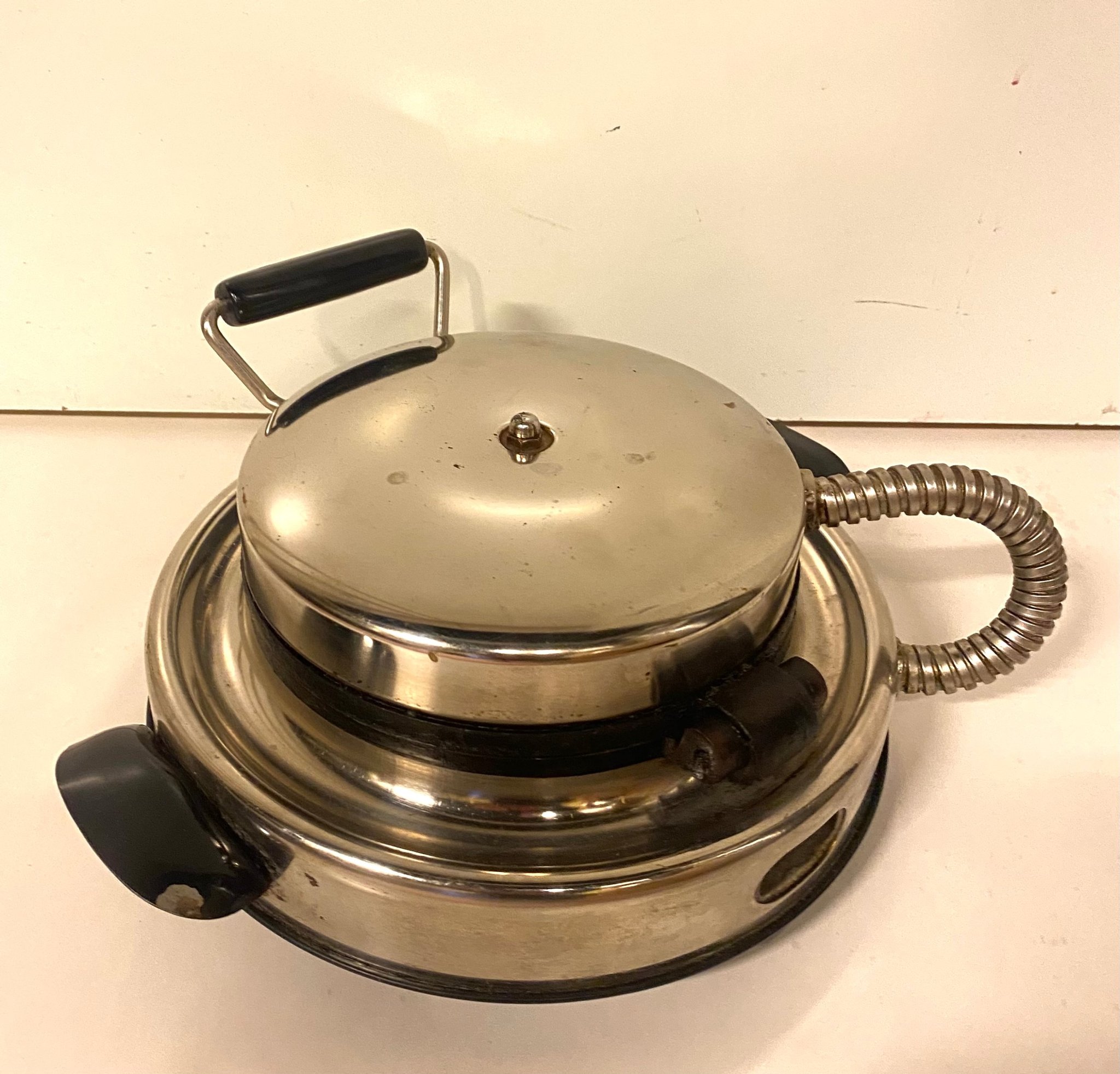 Farsan vann den på en skidtävling på tidigt femtital. Funkar utmärkt men man får passa den då den är av indiansk modell – den skickar röksignaler när bröden är färdiga.