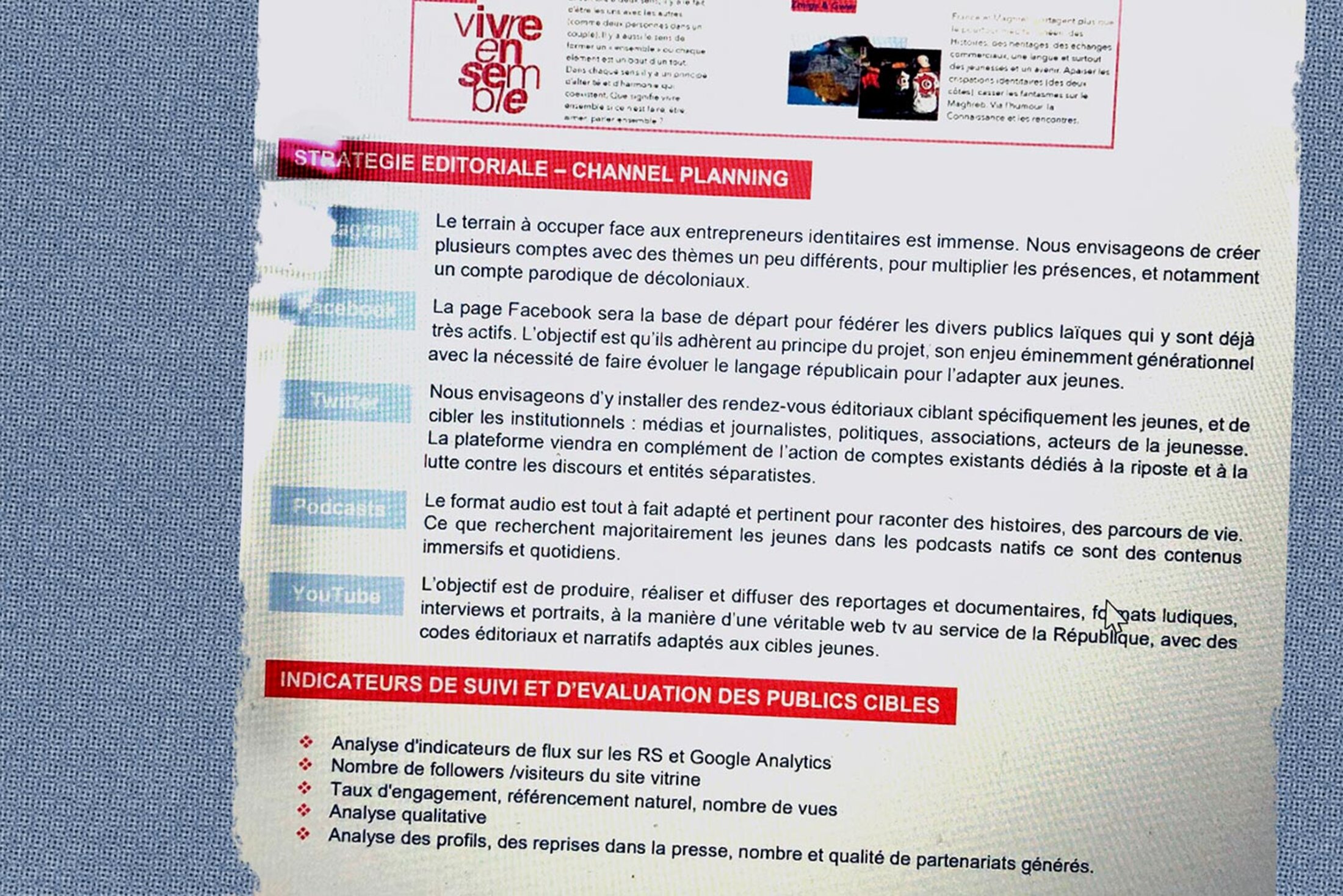 Outre les vidéos diffusées sur YouTube, dont plusieurs ont servi à dénigrer des adversaires politiques d’Emmanuel Macron, la toute jeune structure prévoit aussi de créer un « compte parodique de décoloniaux » sur Instagram ou de se déployer sur Twitter en « complément de l’action de comptes existants dédiés à la riposte et à la lutte contre les discours et entités séparatistes ». Lorsque la candidature de Reconstruire le commun a été analysée par le comité de sélection, l’association a d’ailleurs été présentée, d’après un document consulté par Mediapart, comme étant en lien avec une autre initiative du même genre, « On vous voit ».
