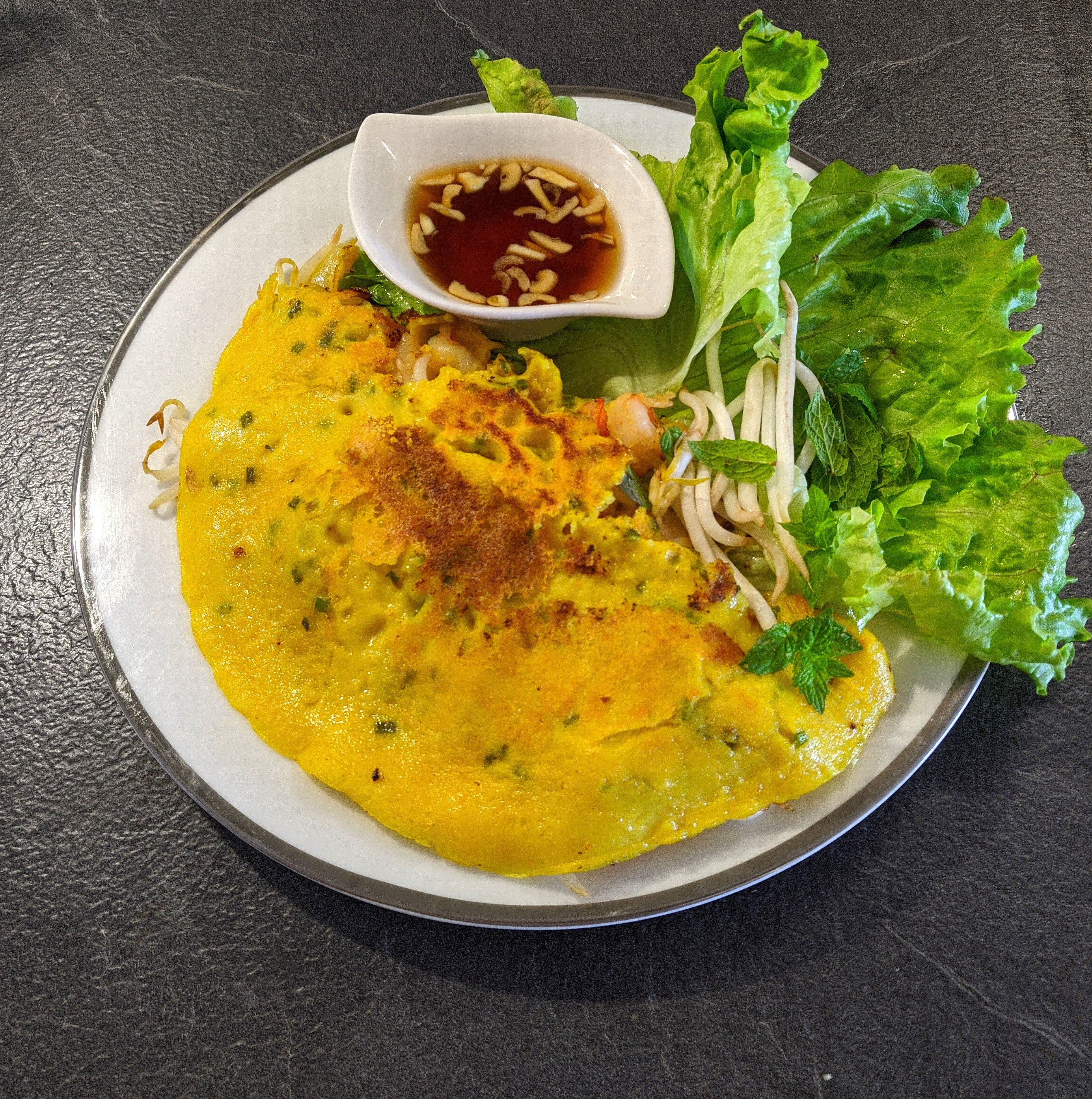 *Le bánh xèo est un plat vietnamien, réalisé comme une crêpe faite à base de farine de riz et de curcuma, pliée en deux et garnie avec de la viande de porc en tranche ou hachée, des crevettes, des graines et des germes de soja.*