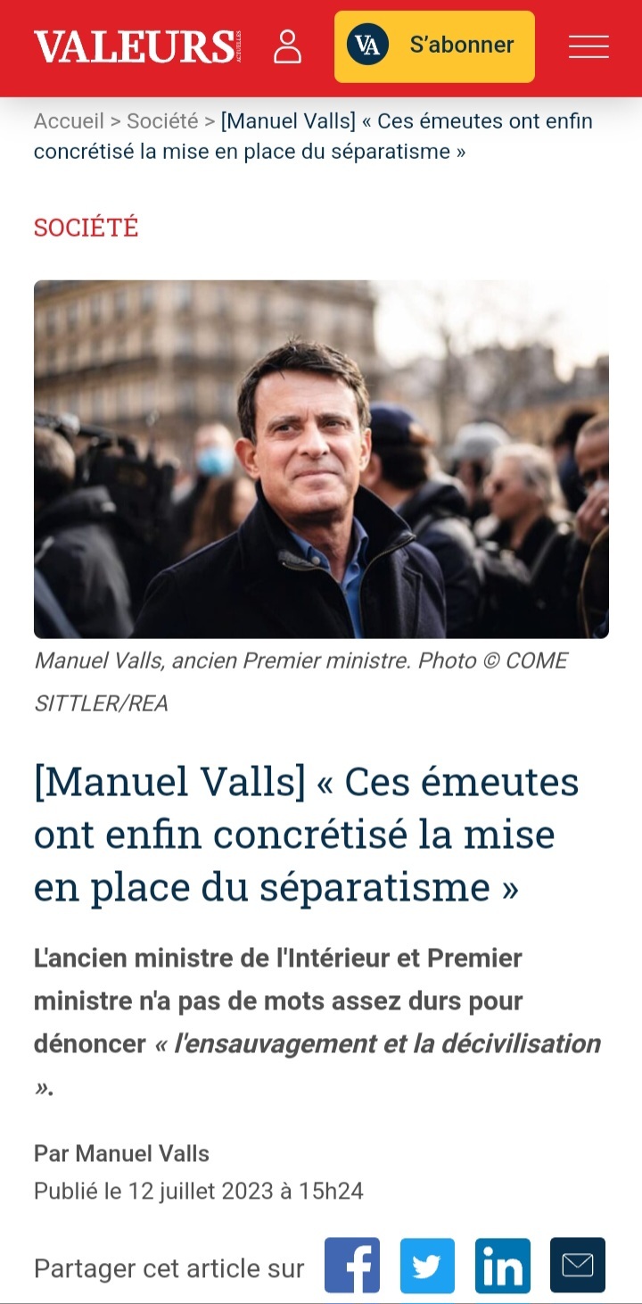 J’ai beau chercher, je ne vois pas une connerie qu’il aurait oublié de citer, tous les mots clés sont là : les seules personnes pour qui la présomption d’innocence n’existe pas, Charlie, islamo-gauchisme, LFI, ultra-gauche, dévoiement de la liberté d’expression… C’est comme si Valls avait demandé à une IA de rassembler tous éléments de langage des fachos, c’est impressionnant.
