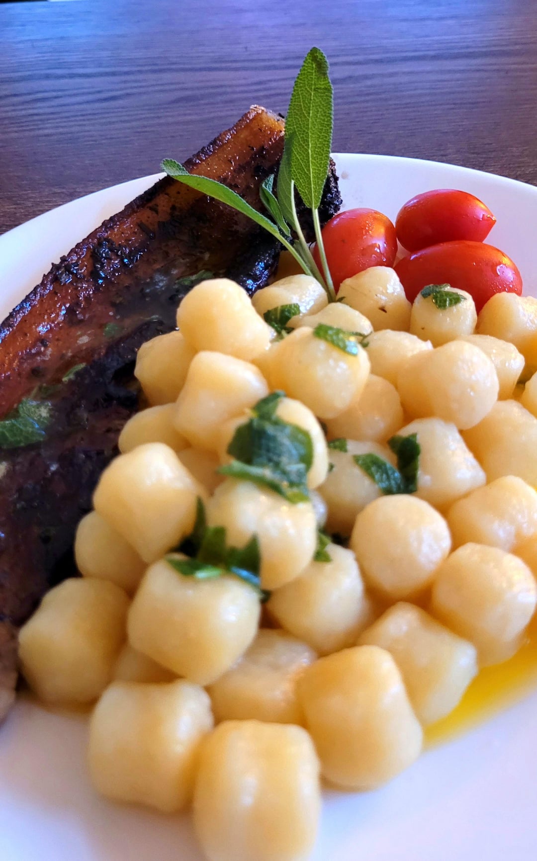 **Hauptspeise: Gnocchi (Gesprochen: Knotschi) und marinierte Schweinebauchscheiben mit Salbeibutter**