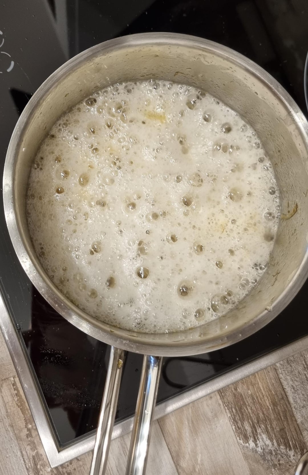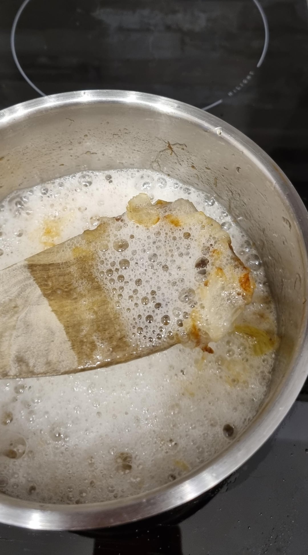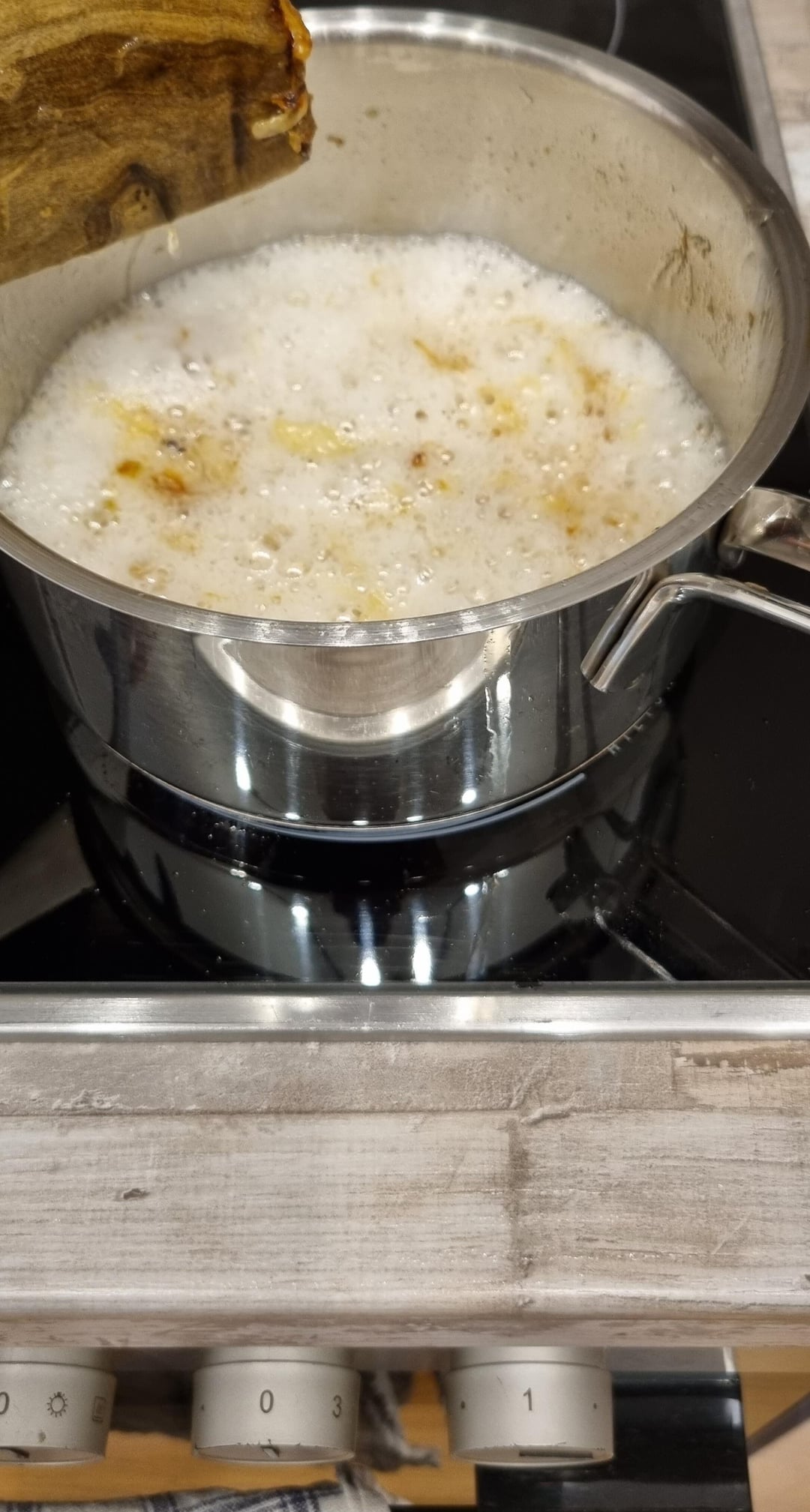 Heute allerdings war das Ganze….schaumig. Zuerst dachte ich, “das wird das Wasser aus den Zwiebeln sein meine Güte”, aber nach 45 Minuten schäumt das Ganze immer noch bzw. ist es sogar mehr geworden. Ich muss dauernd rühren, weil der Schaum sonst überkocht und sehe auch sonst nicht, wie der Stand der Dinge/der Grad der Bräunung ist.