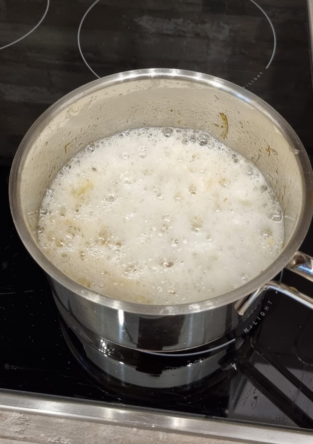 Eine Änderung der Temperatur am Herd oder das Hinzugeben von mehr Öl war beides irrelevant für die Schäumung. Der Topf ist der gleiche wie sonst auch, der Herd ist dank Übersiedeln ein anderer. Die Zwiebeln wurden heute gekauft, das Öl ist die gleiche Marke wie sonst auch.