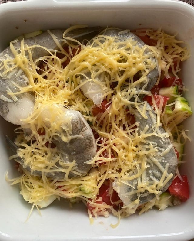 Fein gehackte 2 kleine Knoblauchzehen hinzufügen (man kann eine Knoblauchpresse verwenden), mit Svan-Salz bestreuen, mischen und mit Pflanzenöl beträufeln. Ein paar gefrorene große Garnelen darauf legen und mit Hartkäse bestreuen (ich hatte keinen Hartkäse, also habe ich mit dem bestreut, was ich hatte).