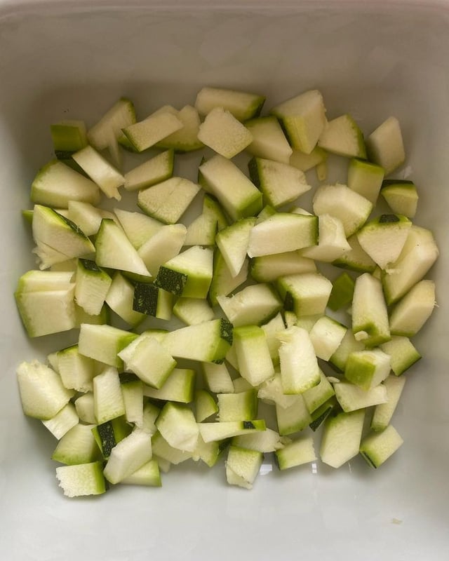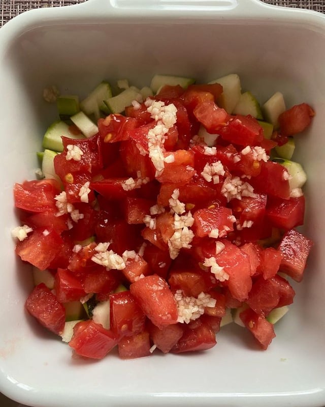 1. 1 kleine Zucchini und 2 Tomaten in 2 Servierschalen (bei mir ca. 15×15 cm) würfeln.