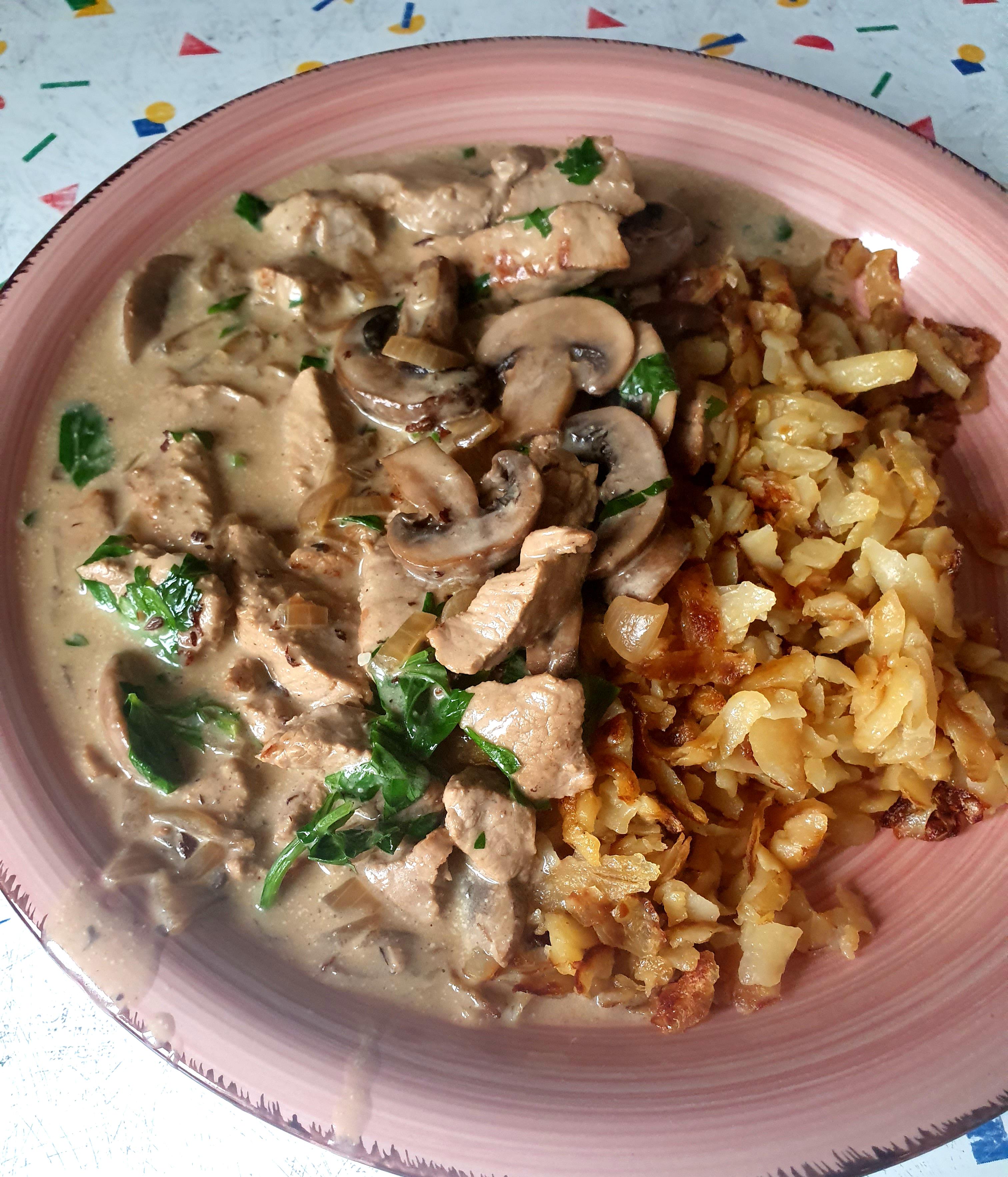 Champignons und Zwiebel kurz andünsten, Wiesswein und Rahm dazugeben. Etwas Maisstärke mit Bouillon mischen, dazu giessen. Nach 2 min. Fleisch wieder in den Topf und kurz erhitzen. Mit Peterli garnieren.