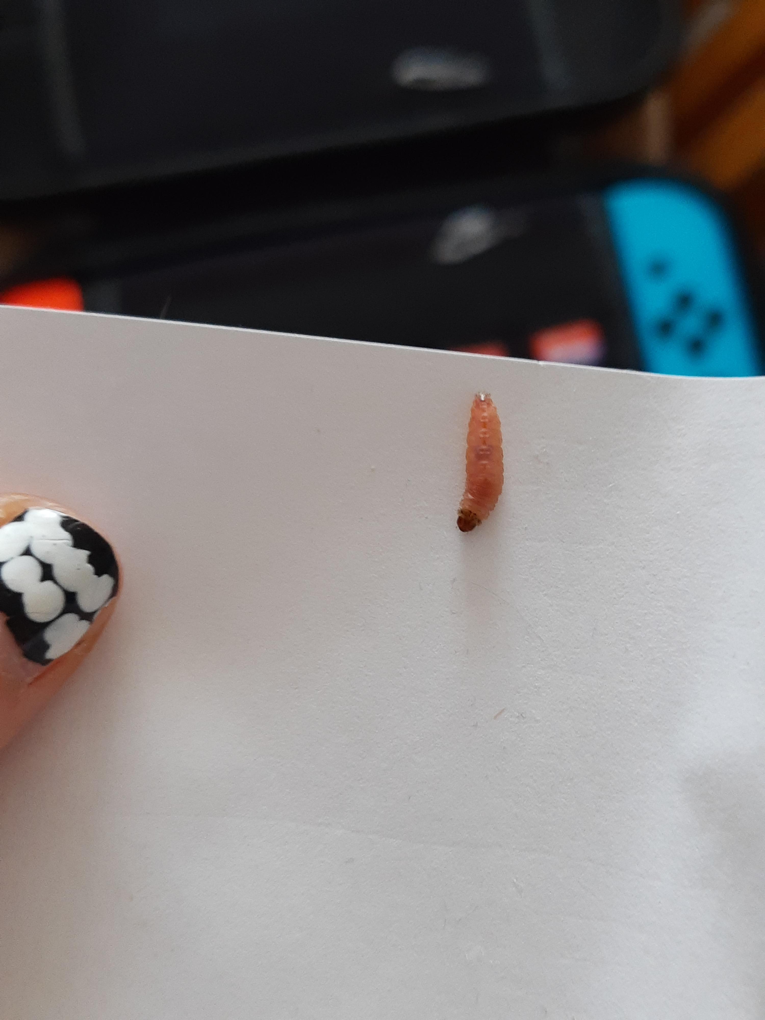 Eine Freundin von mir war im Urlaub an der Nordsee und hat heute beim Taschen ausräumen diesen kleinen Kerl in der Switch Tasche gefunden. Der hat sich neben der Konsole gemütlich gemacht und etwas vom textil der Tasche angeknabbert (wo es sich anscheinend verpuppen wollte). Die Larve ist auch etwas leicht rötlich gefärbt und ca 1cm lang.
