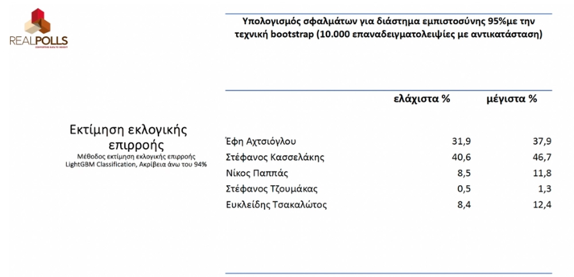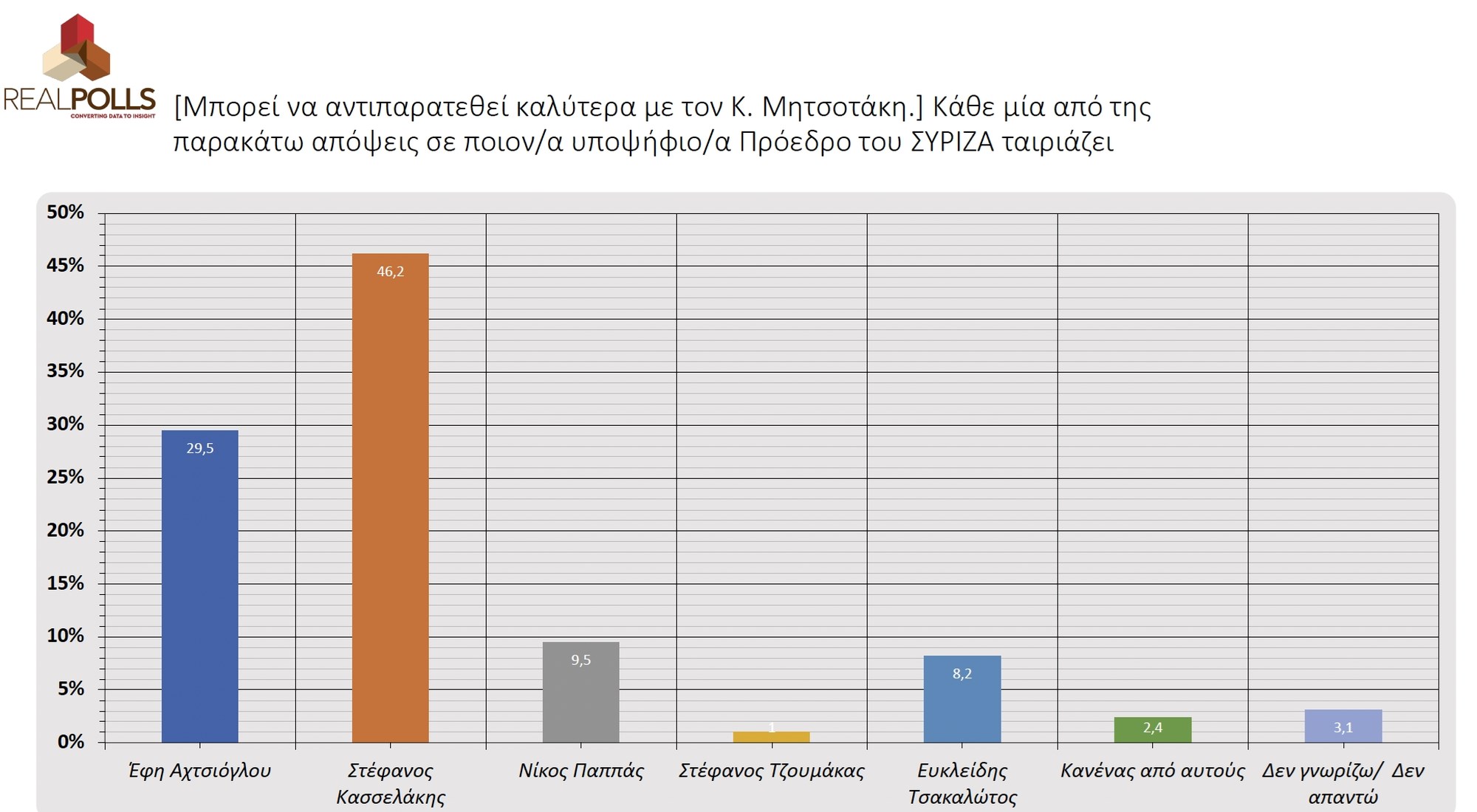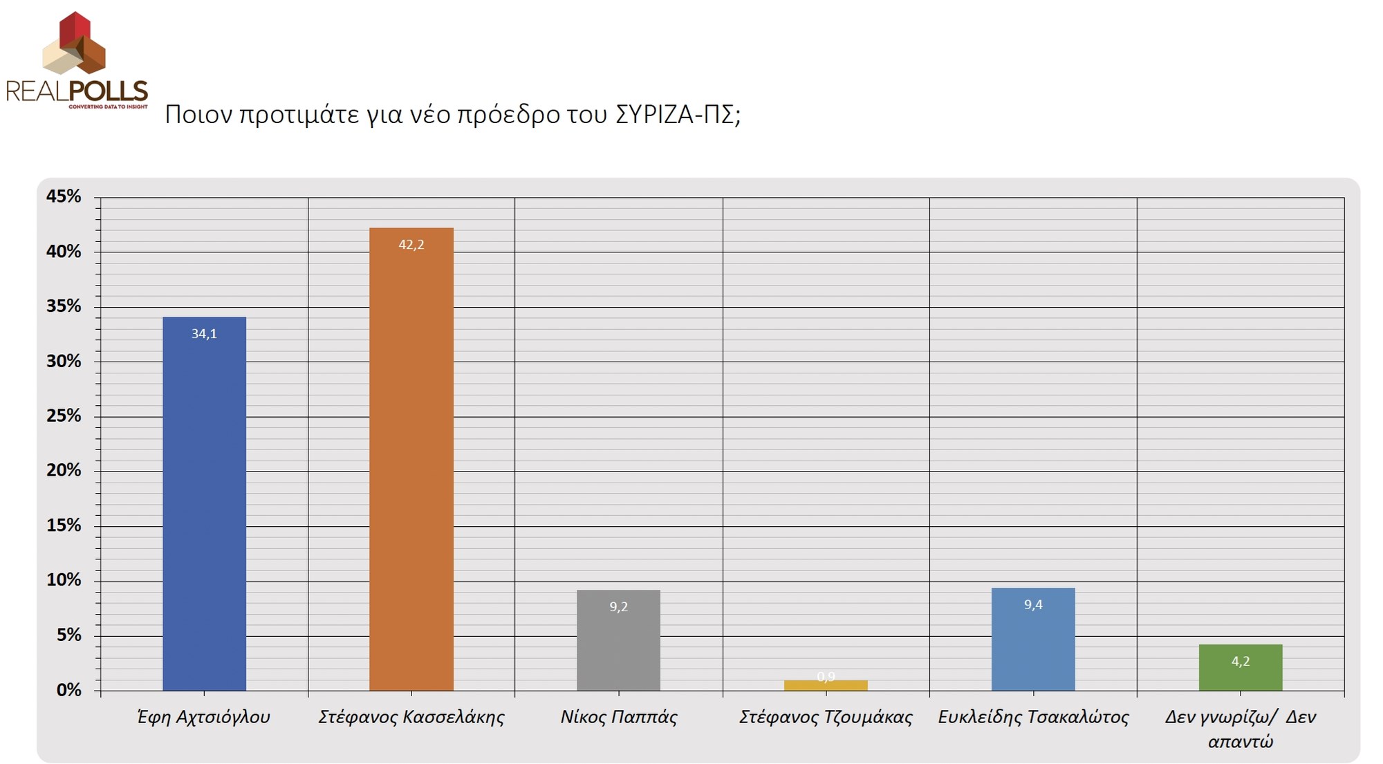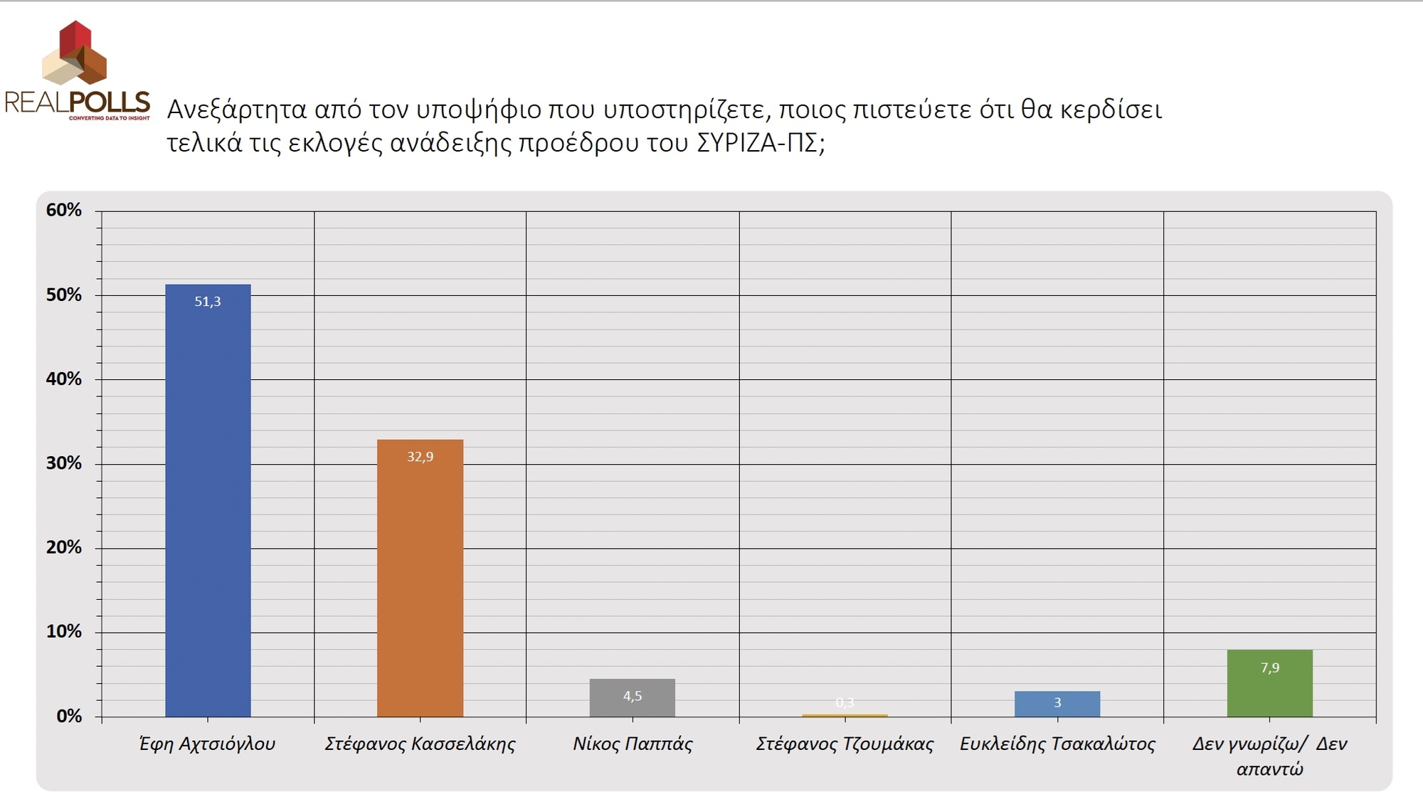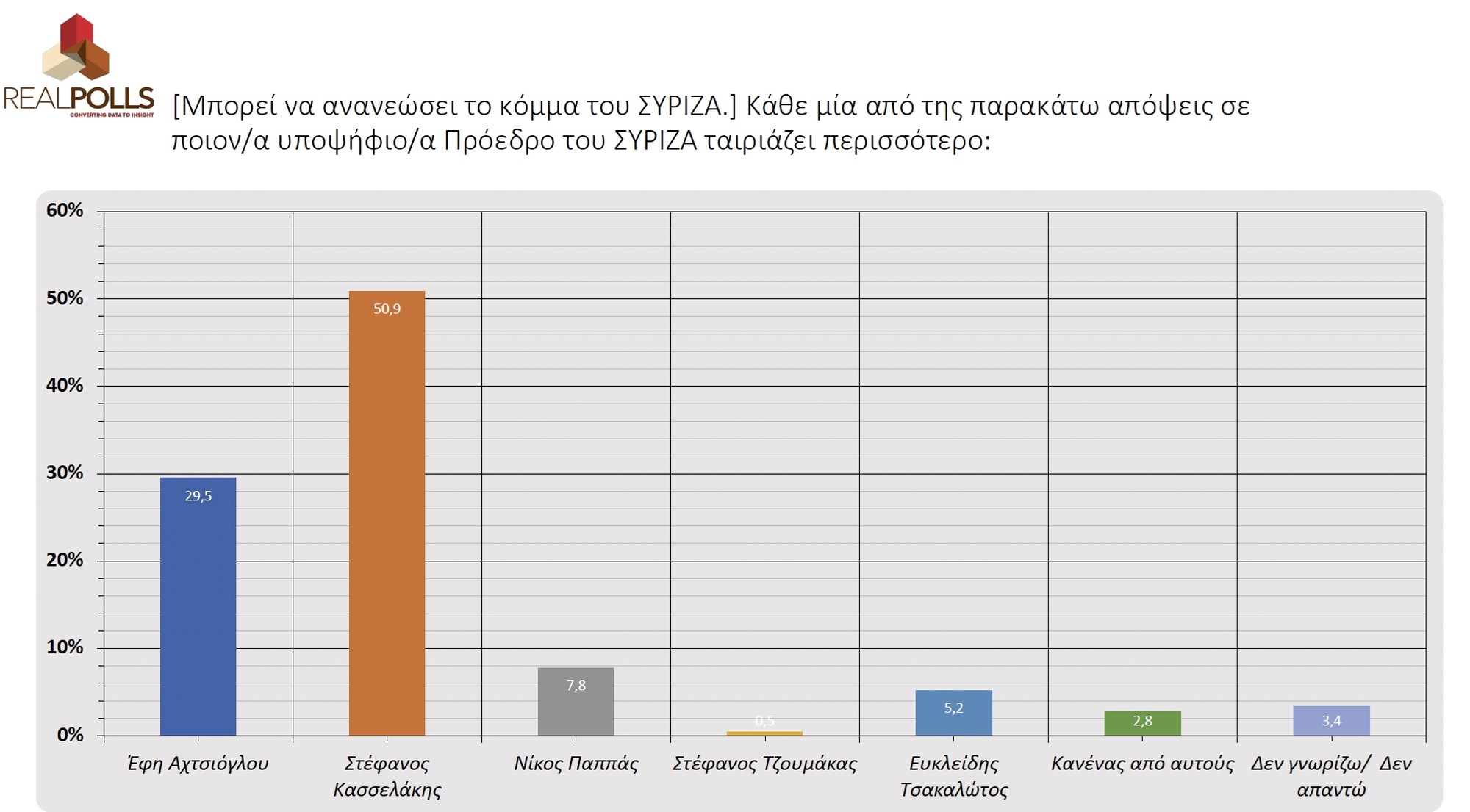 >**Μία δημοσκόπηση της Real Poll έρχεται να δώσει μια διαφορετική εικόνα για τη μάχη στον ΣΥΡΙΖΑ και την ηγεσία του κόμματος. Σύμφωνα με τα ευρήματα, ο νεοεμφανισθείς Στέφανος Κασσελάκης προηγείται της Έφης Αχτσιόγλου με σχεδόν 8%.**