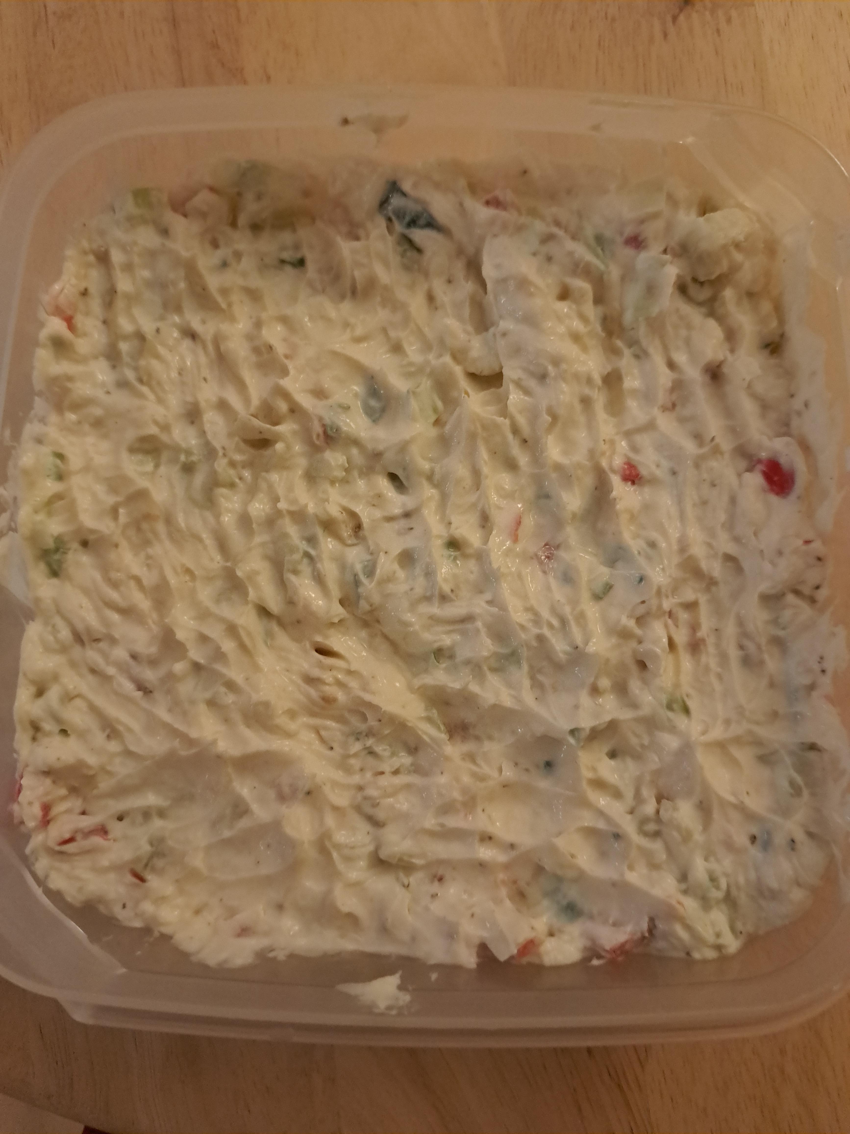 Hallo zusammen, ich habe einen Aufstrich aus Doppelrahmfrischkäse und verschiedenem frischen Gemüse gemacht. Dabei sind Tomaten, Frühlingszwiebeln, Spitzpaprika und Gurken ohne Kerngehäuse. Alles sehr fein geschnitten. An Gewürzen ist nur Salz und Pfeffer dran.