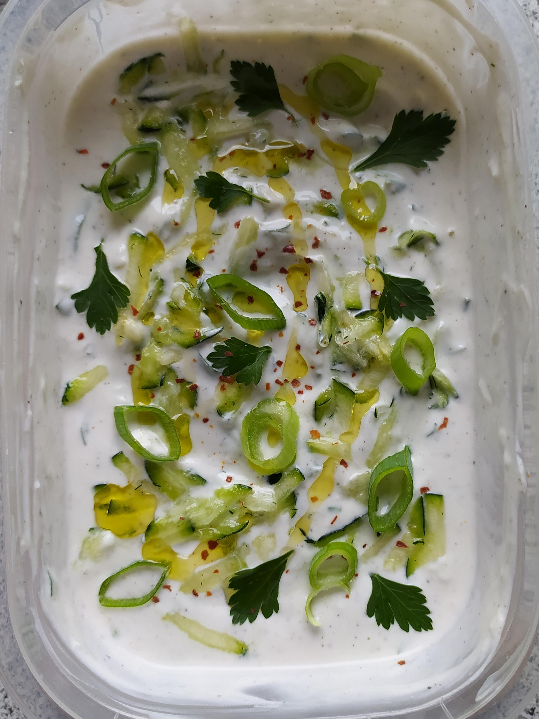 Anmerkung: Dieses Wochenende ist Resteverwertung dran, die Zutatenmenge ist grob geraten und natürlich nicht unbedingt traditionell. Der Dip zieht über Nacht im Kühlschrank, aber kann eigentlich auch gleich nach der Zubereitung gegessen werden. Die Dekoration ist natürlich nicht ausschlaggebend für den Geschmack, aber wenn man den Dip zum spätsommerlichen Grillabend mitbringen will macht das sicher schon was her. Naja, und zu Hause isst das Auge ja auch mit.