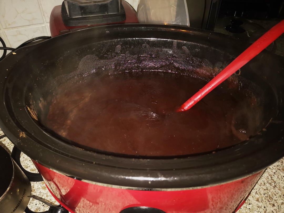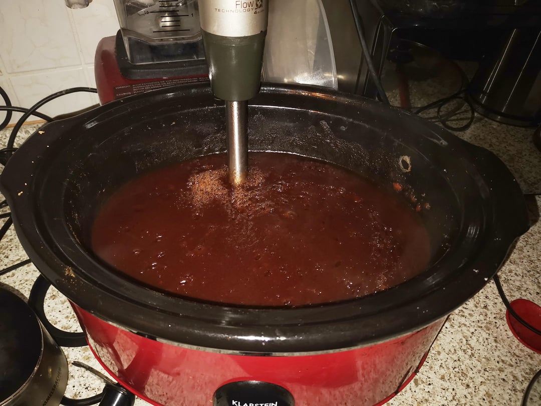 Am nächsten Morgen rühre ich das Ganze durch und püriere es mit dem Mixstab. Danach lasse ich es weiter köcheln.