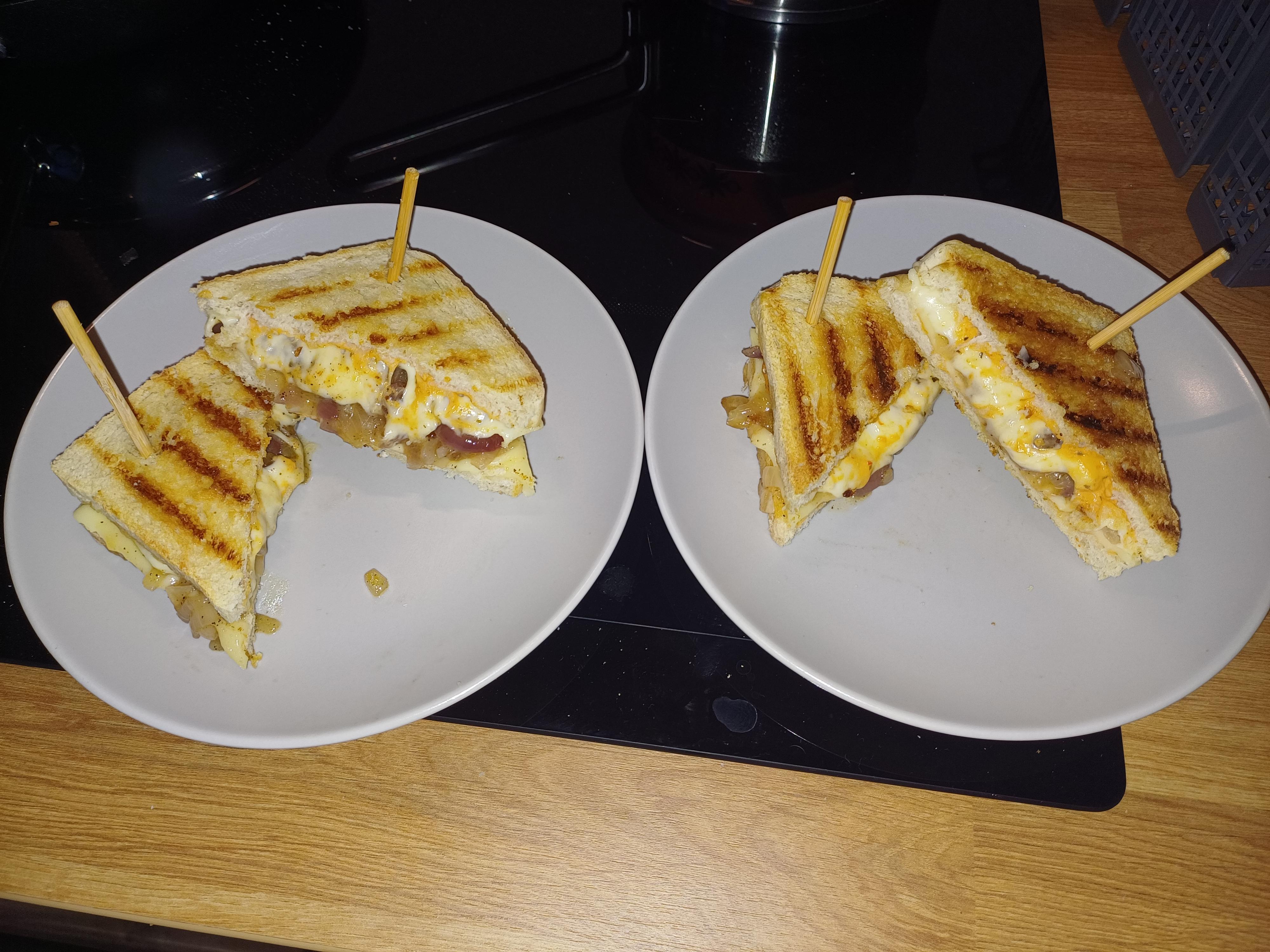 Dann auf dem Kontaktgrill 4 Scheiben Toast mit der gebutterten Seite nach unten geröstet. Auf die Oberseite hab ich Paprikaaufstrich geschmiert und Gouda gelegt. Zwei der Toasts habe ich mit umgedrehten Töpfen abgedeckt und die anderen beiden Toasts jeweils mit den Zwiebeln bestückt und gepfeffert. Wenn der Käse anfängt zu verlaufen, können die Sandwiches zusammengebaut werden.