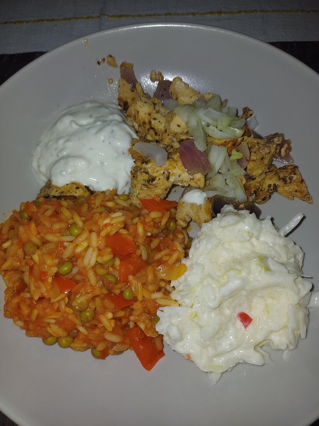 Tsatsiki anrühren mit griechischem Joghurt, Olivenöl, Salz, Essig, Dill, etwas Zitronensaft, etwas Zucker. Knoblauch, etwas Zwiebel und Gurke hab ich mit ner Knoblauchpresse reingepresst.