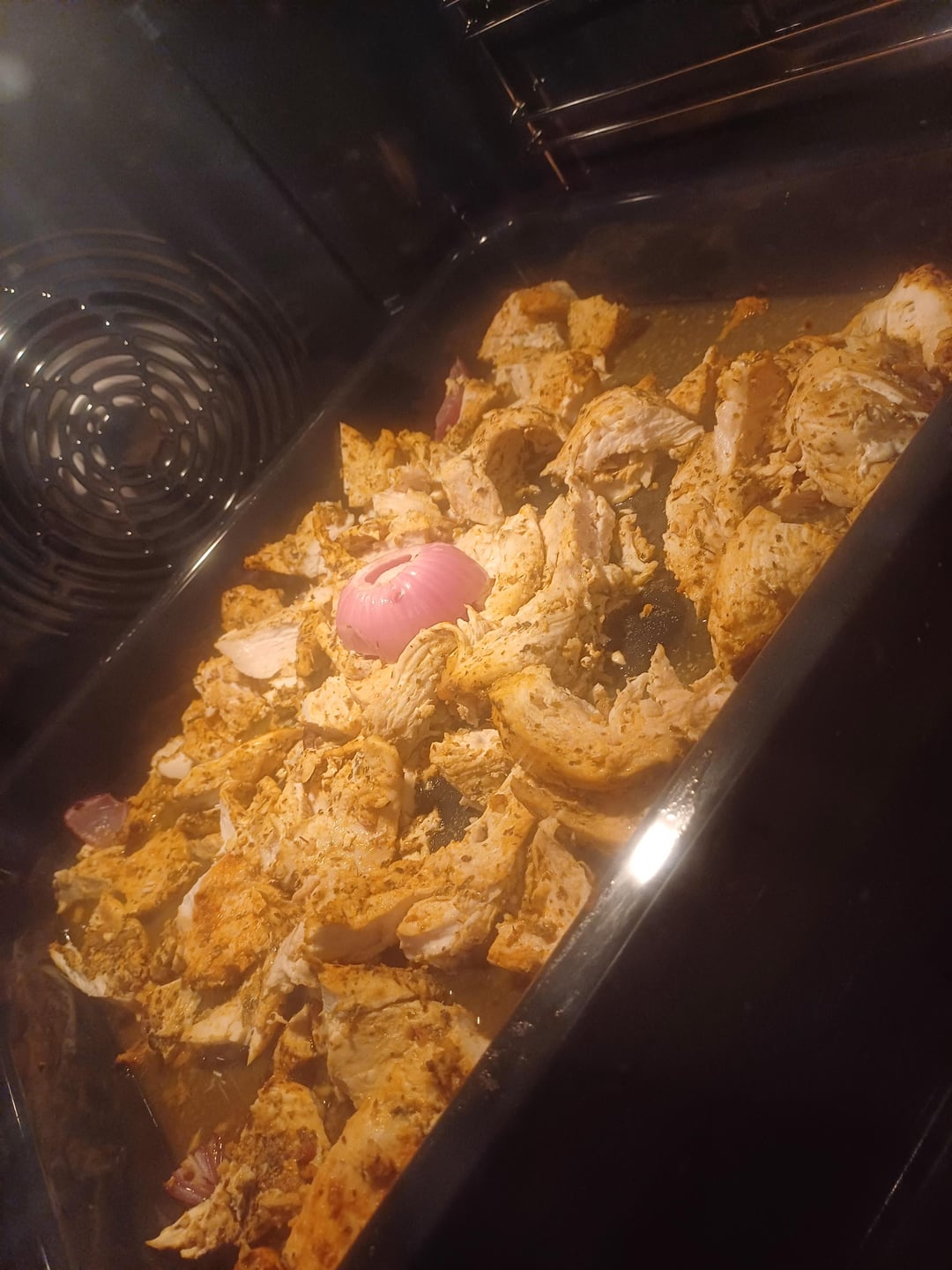 Hähnchen mit Marinade nach Wahl auf eine große halbe Zwiebel stapeln und mit Spießen fixieren (ist bei mir umgekippt, hab das Fleisch dann einfach aufgeschnitten).