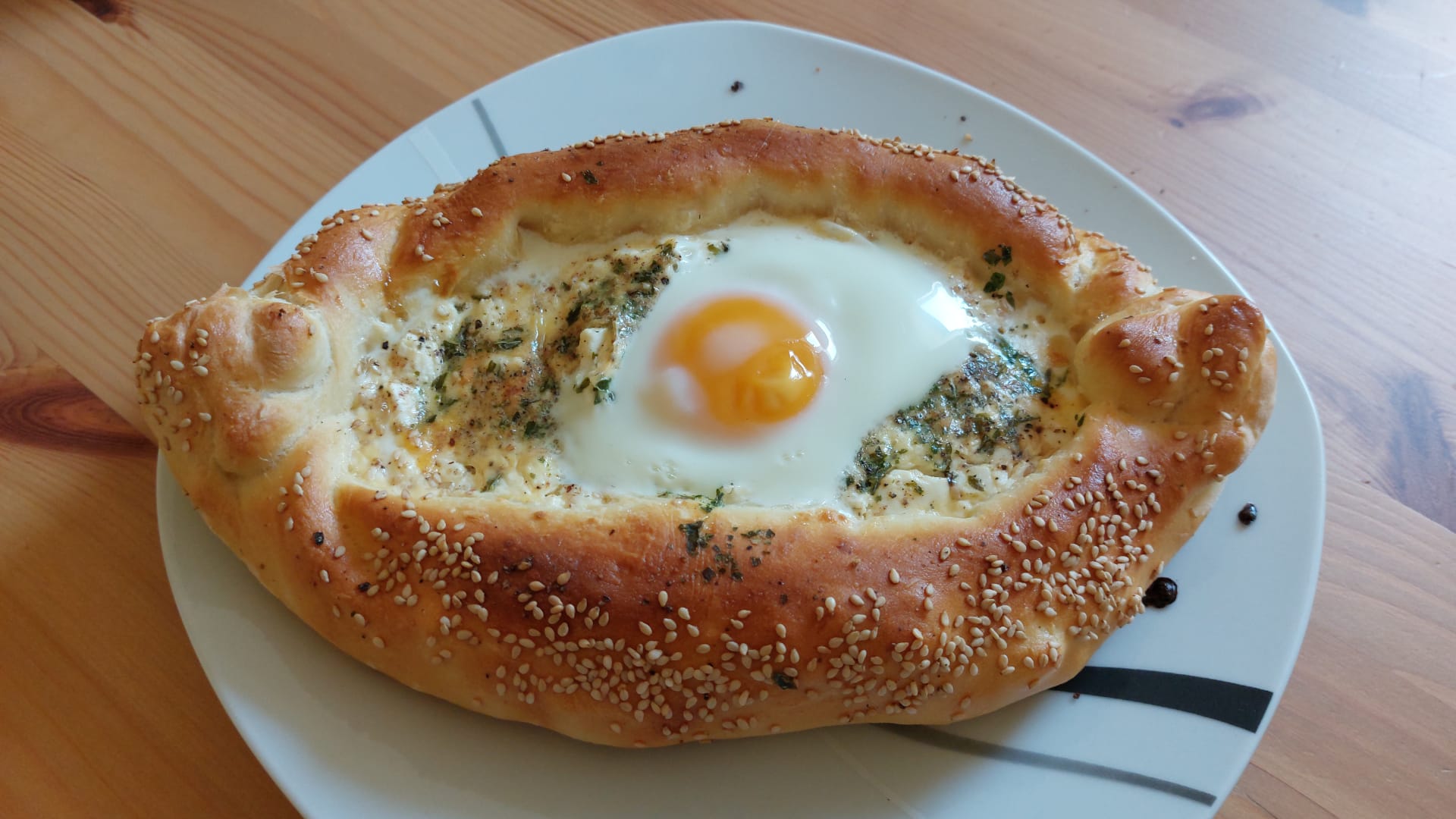 Für mich ungewohnt sind hier das Sesam und die Kräuter, die ich noch nie auf Khachapuri gesehen habe, bin aber sicher, es war dennoch sehr lecker.