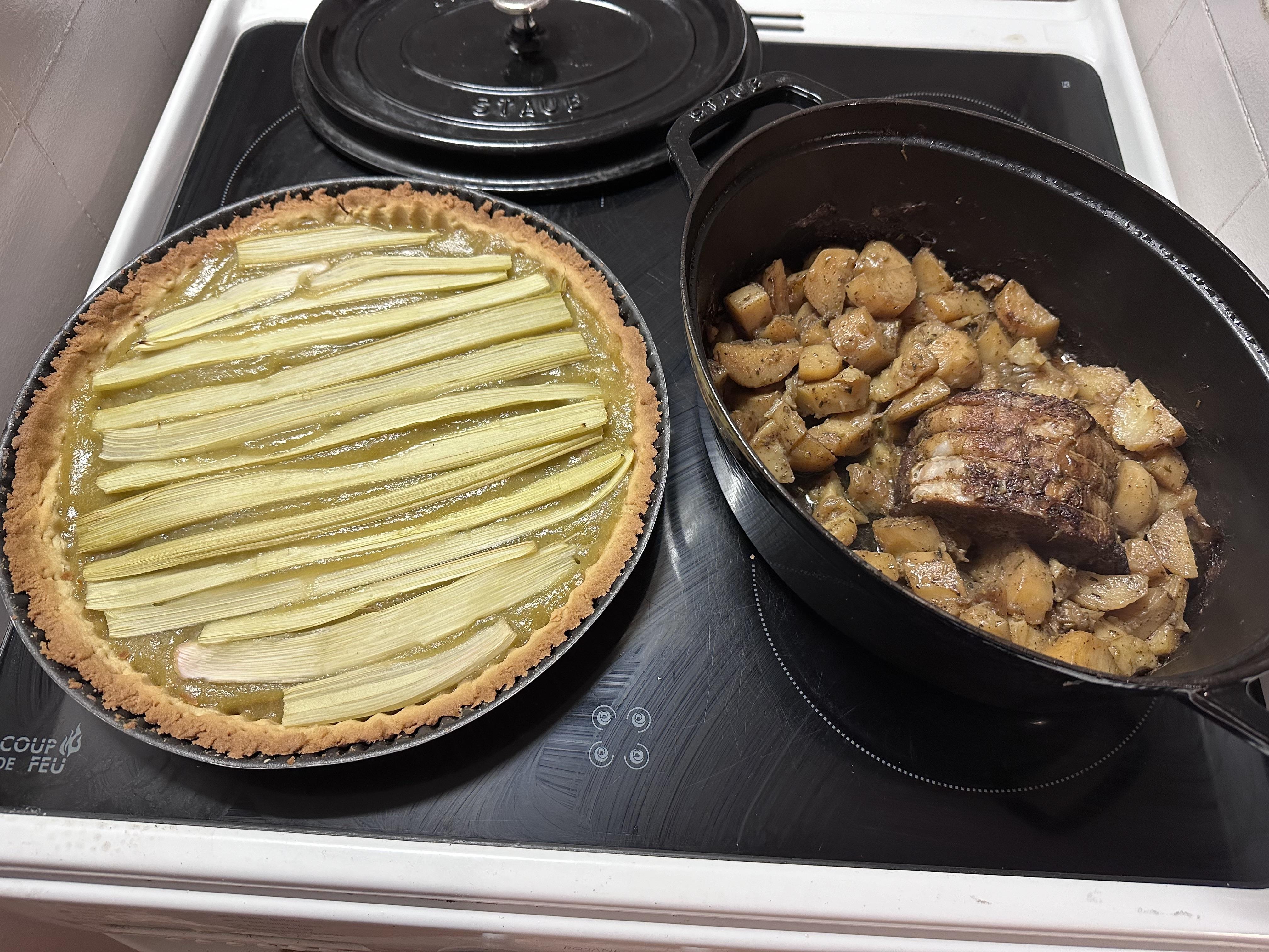 Repas tous simple pour le fiston : rôti de porc, pdt et tarte à la rhubarbe