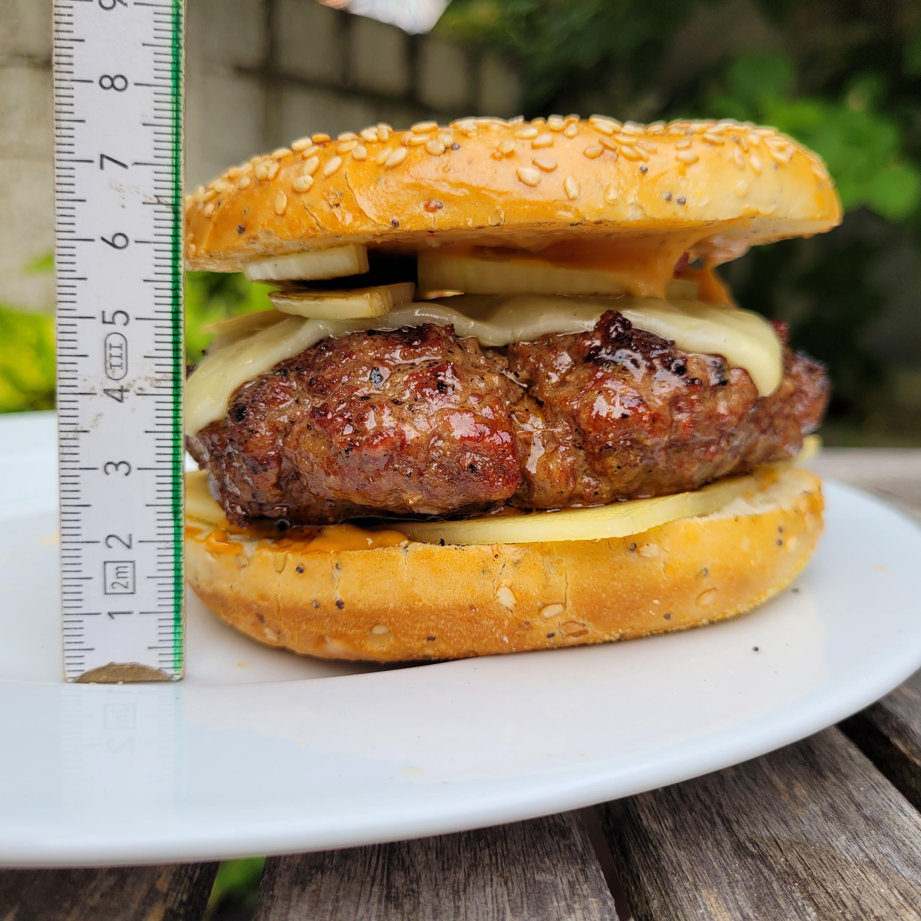 1. 270g Bio Rinder Hack vom Metzger, frisch gemahlener schwarzer Pfeffer und Birds Eye Chili Flocken im Patty, vor dem Grillen in Frischhaltefolie gewickelt und eine Stunde bei -18°C ins TK Fach gelegt