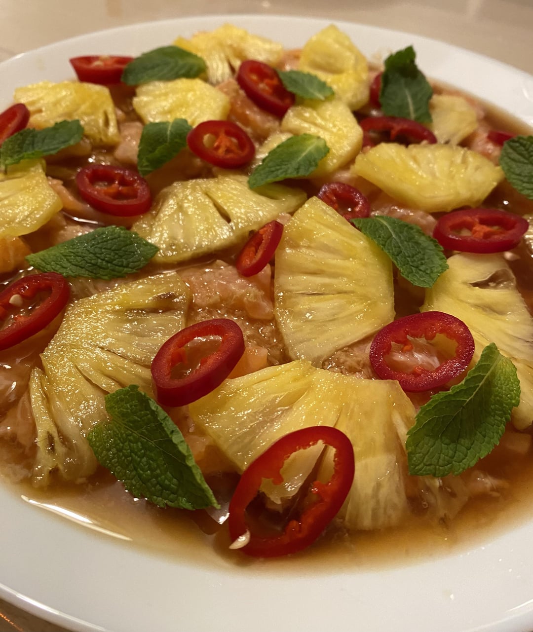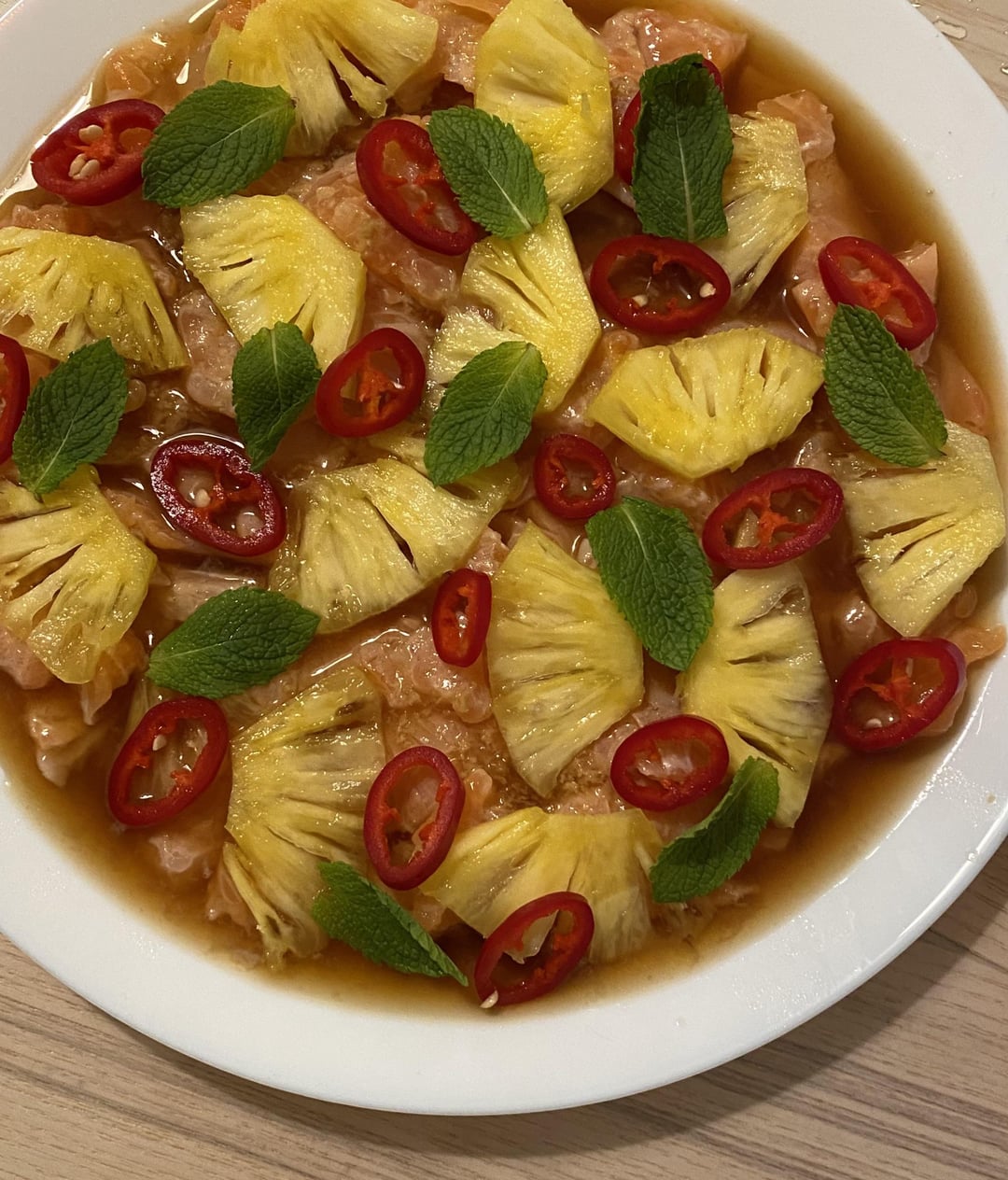 Saumon – ponzu – citron vert – gingembre – ananas – piment – menthe