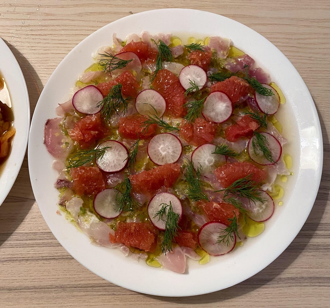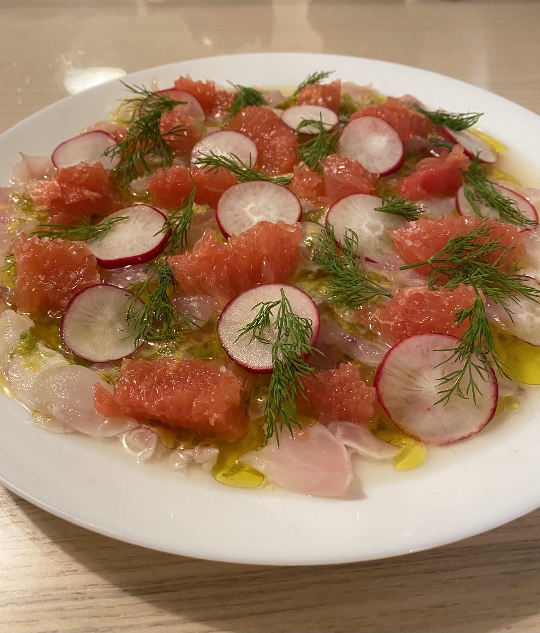 Dorade – huile d’olive – vinaigre de riz – zestes citrons jaunes et verts – pamplemousse – radis – fleur de sel – aneth