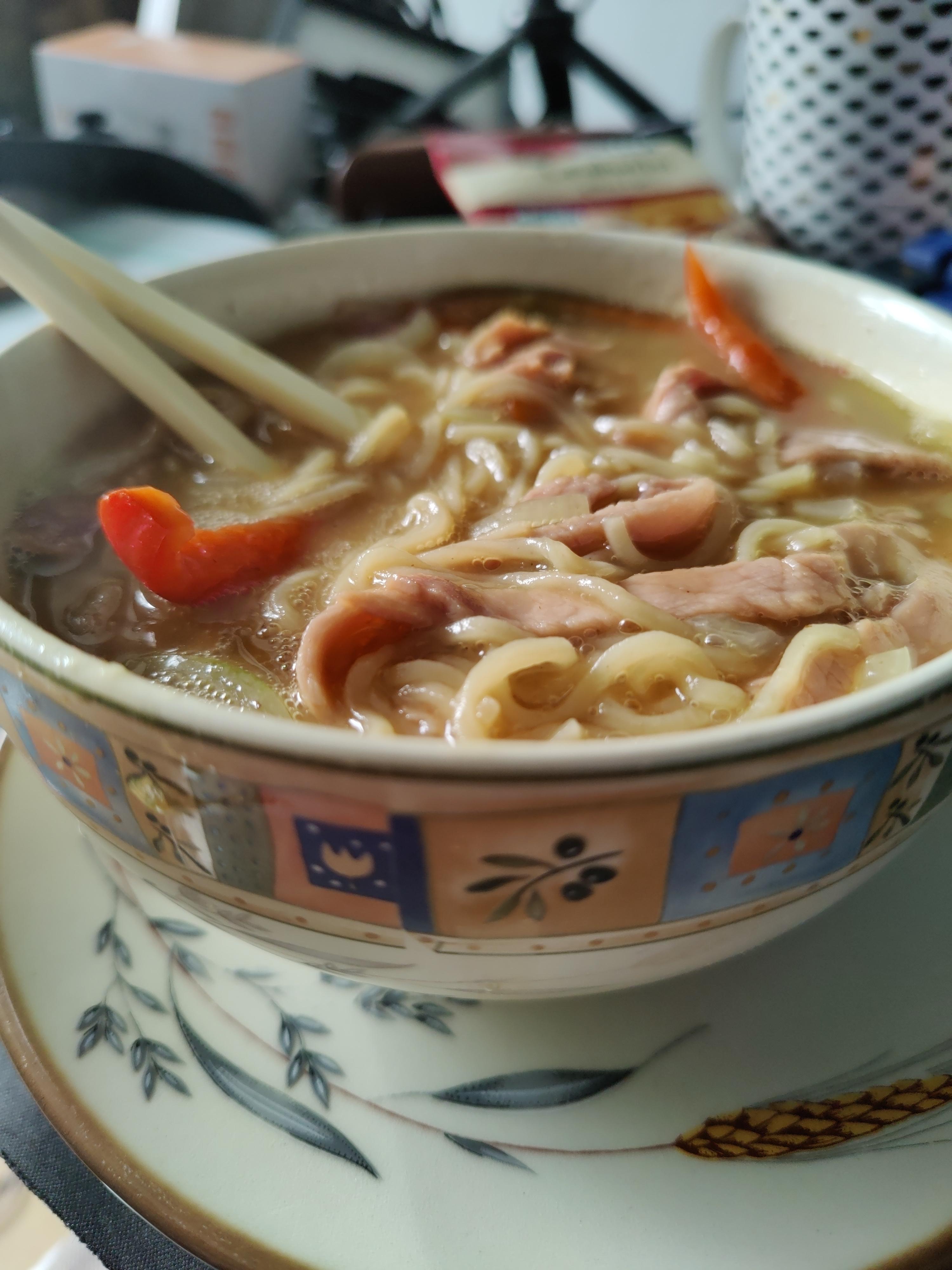 Nouilles instantanées et ses épices/graisse, jambon, oignons, poirvons, une cuillère de fond de veau, une cuillère de miel, 2 oeufs