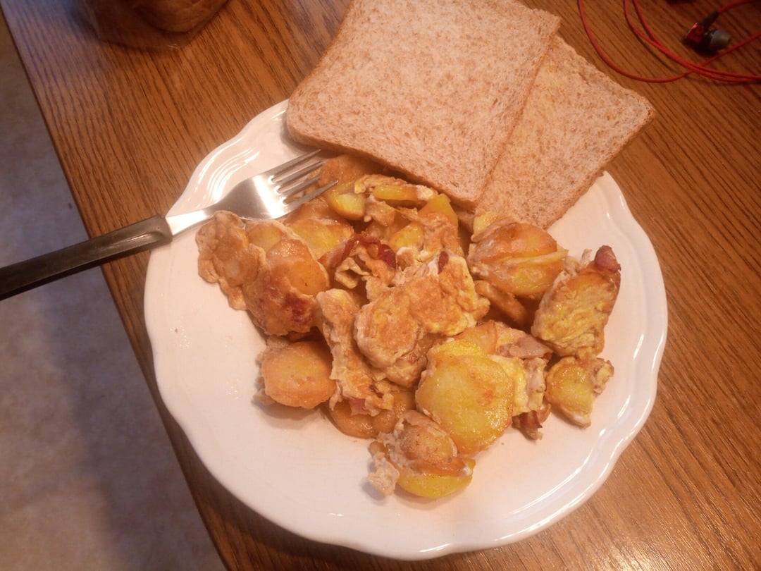 wenn die Kartoffeln gleichmäßig angebraten und goldbraun sind den Bacon grob zerreisenund mit braten. Eier hinzugießen wenn der Bacon angebraten ist, anschließend constant wenden bis das Ei leicht engebräunt ist.