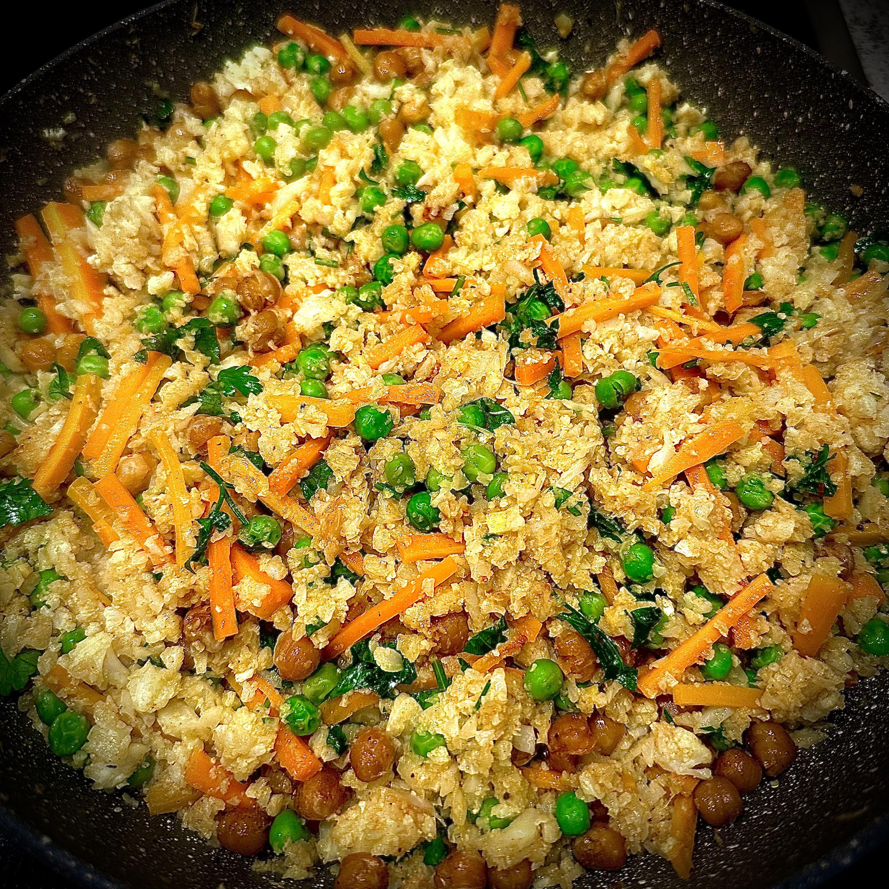 Dementsprechend gab es gebratenen Blumenkohl ‚Reis‘ mit Gemüse und gerösteten Kichererbsen.