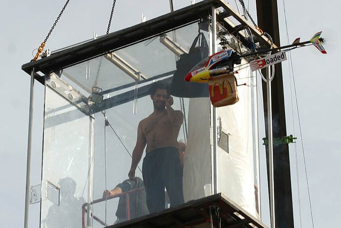 The thing I remember most from this was watching him in his box live on the news before school. During the broadcast, someone threw a burger or something at his glass box. It woke him up and he just watched it as it slowly slid down the side. Bloke must have been starving at that point. For some reason, it made me laugh at the time. The British public are something else.