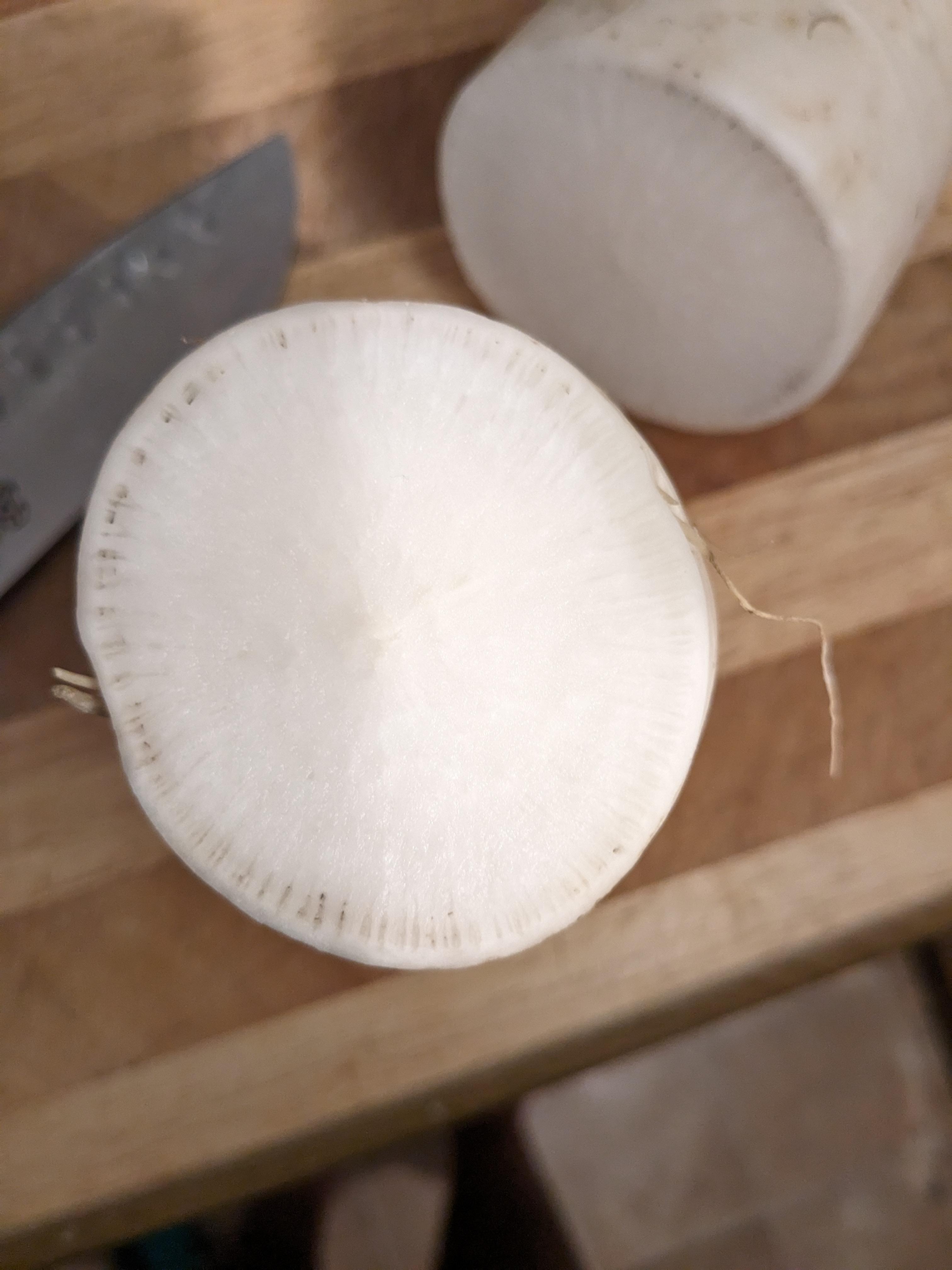 Hier gab es mal vor drei Monaten eine Anfrage zu einem Rettich, bei dem es genau andersrum war, da war der Rand weiß und innen alles schwarz :’) Das würde zu der Schwarzfäule passen, die mir online vorgeschlagen wird, wenn ich nach “Rettich schwarzer Rand” suche.