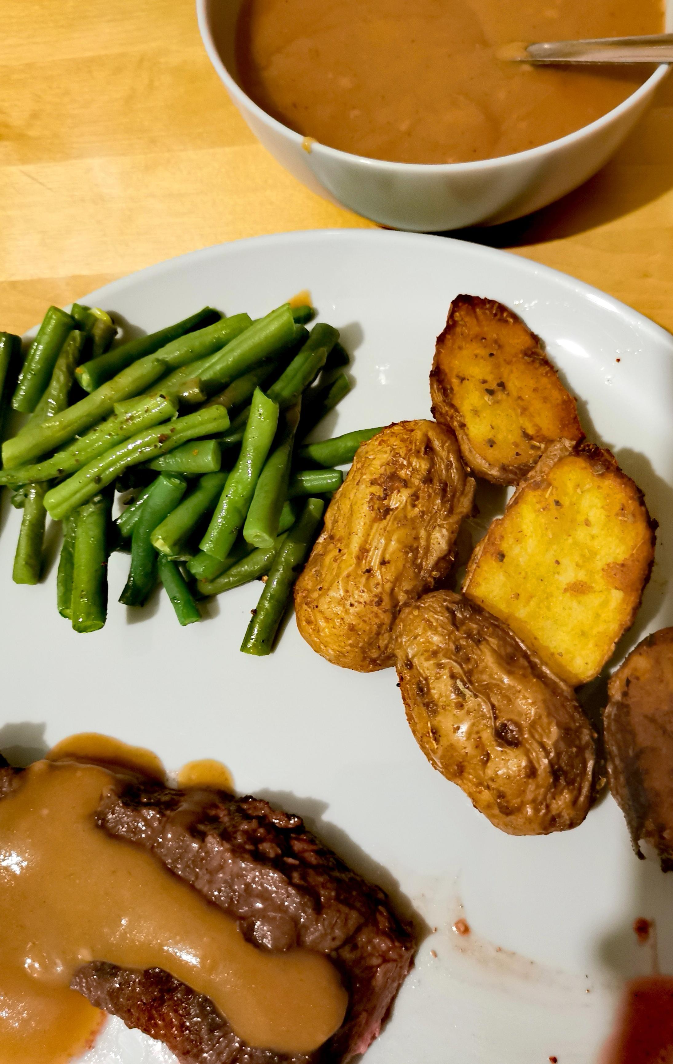 Hampe de bœuf, haricots et pomme de terre rôtis