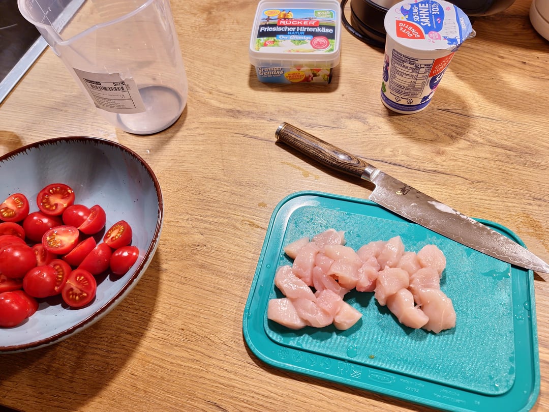 Also erst das Hänchen anbraten, dann die Cherry Tomaten dazu, dann würzen.