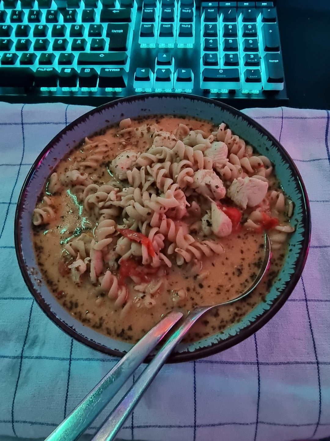 Dann das mit ca 500ml Hühnerbrühe aufgießen. Dann die Nudeln rein und 15 min köcheln lassen. Nach den 15 min kommt ein bisschen Sahne und der Feta dazu und das alles nochmal 5 min ziehen lassen.