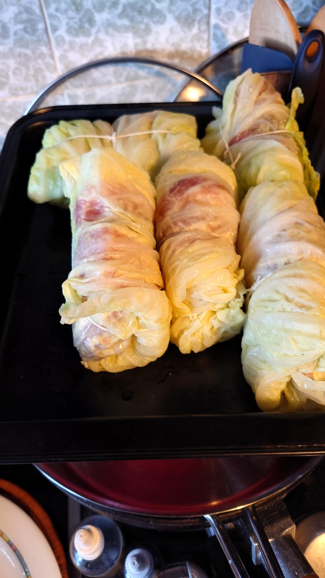 Zwei Blätter mit übereinander legen und mit 2-3 Speckstreifen auslegen, die sollten die ganze Roulade lang passen, dann ca 150-200g der Frikadellen Masse draufgeben und straff wickeln.