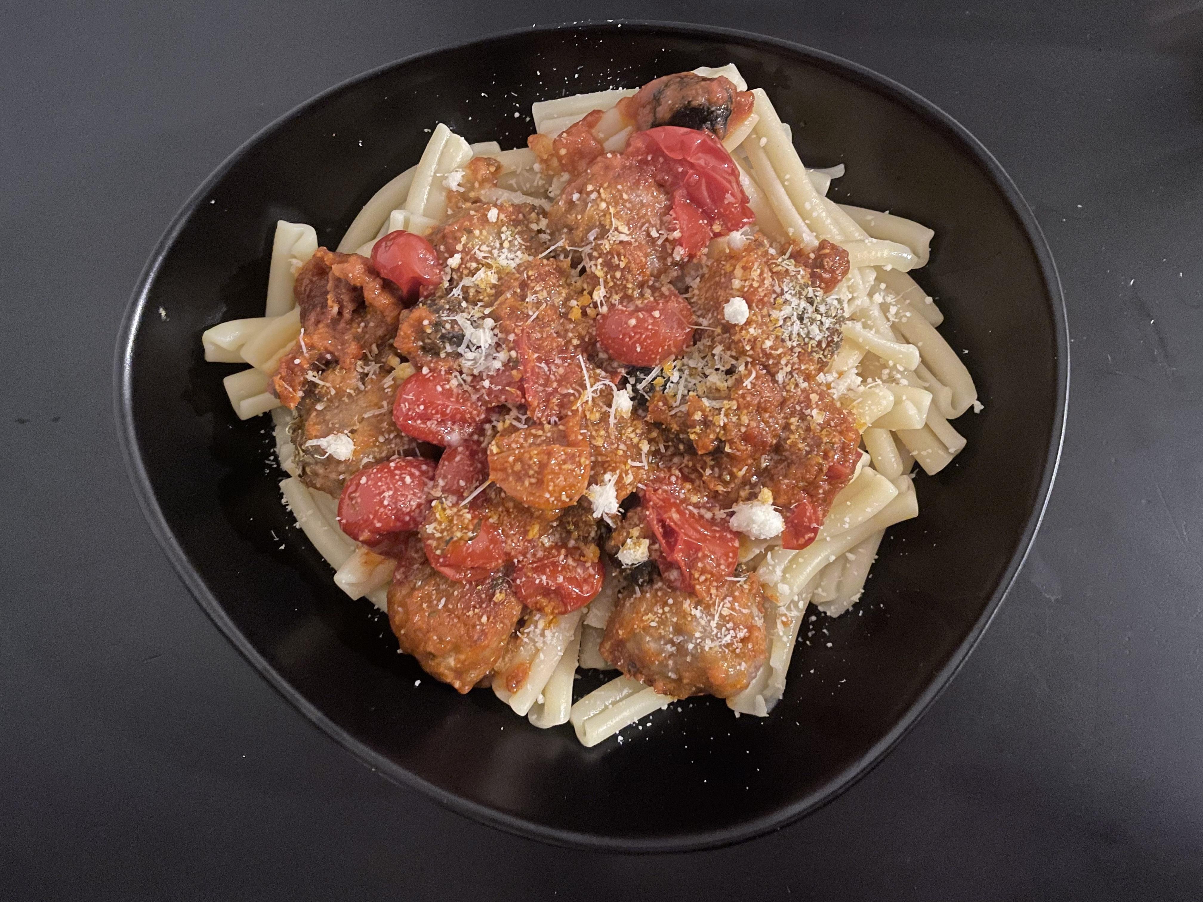 Die Sauce, besonders mit gefrorenen Fleischbällchen, erhält man in einer Antihaftpfanne. Einfach alles rein wenn Pfanne heiß ist, Deckel darauf und auf niedrige Stufe köcheln lassen.
