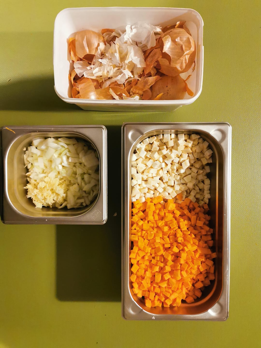 -Sellerie(664 g), Karotten(1007 g) und Zwiebeln(398 g) schälen und würfeln