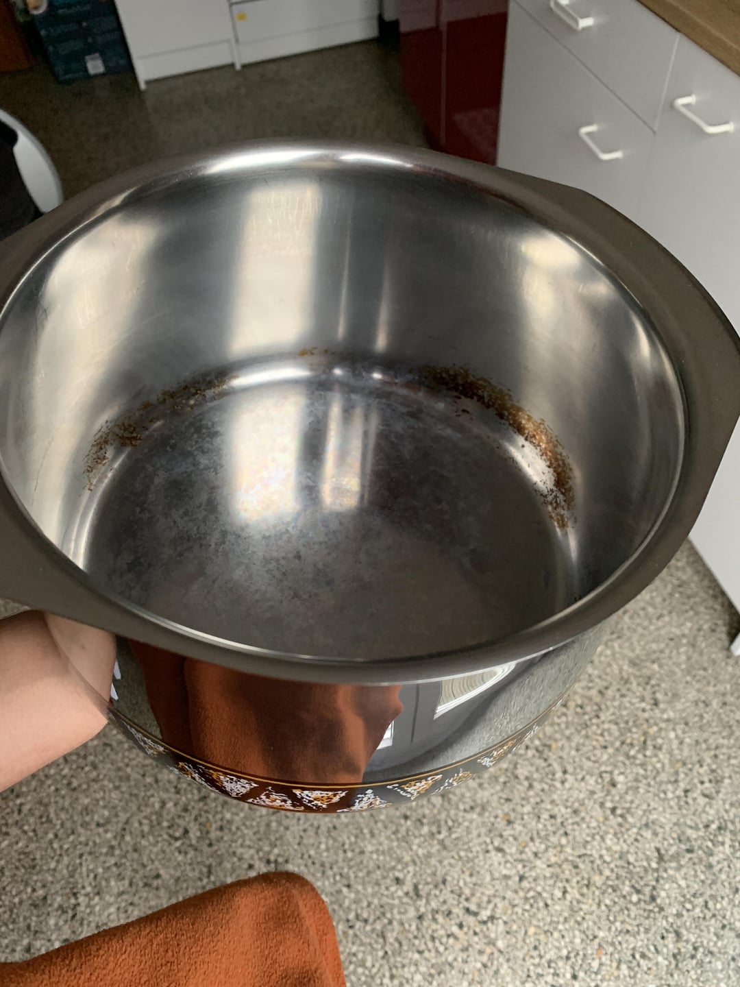 Hallo, ich habe hier meinen großen Topf der für Eintöpfe und Chilli benutzt wird. Wie auf den Bildern zu sehen ist, brennt sich beim (auch sehr leichten) anbraten von Zwiebeln immer nur am Rand etwas ein. Ich habe beim Kochen auch schon darauf geachtet und es kommt wirklich nur zum anbrennen, wenn die Zwiebeln den Rand berühren. Das eingebrannte geht auch wirklich nur sehr mühselig mit Essigessenz und viel Schrubben weg. Hat jemand einen Tip oder wenigstens eine Erklärung dafür. Mit dem gesamten Boden habe ich keine Probleme und es brennt dort nichts an/ein.