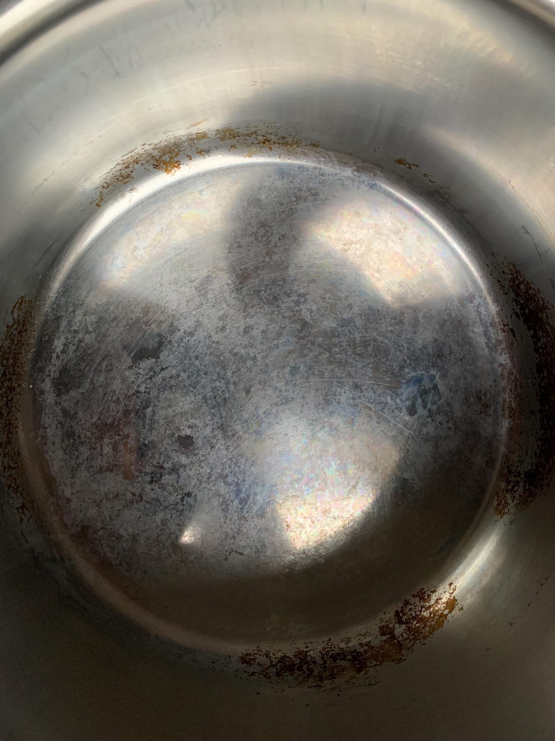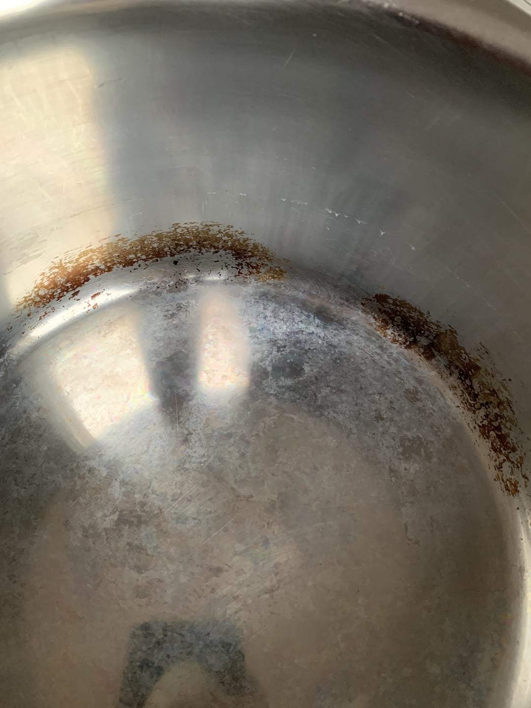 über das wieso kann ich dir nichts sagen, aber es sieht aus als könnte man die Flecken easy mit einem dieser metallschwämme (k.a. wie das heißt) wegmachen. klappt bei mir zumindest hervorragend und meine flecken sehen genauso aus (nur an anderem stellen).