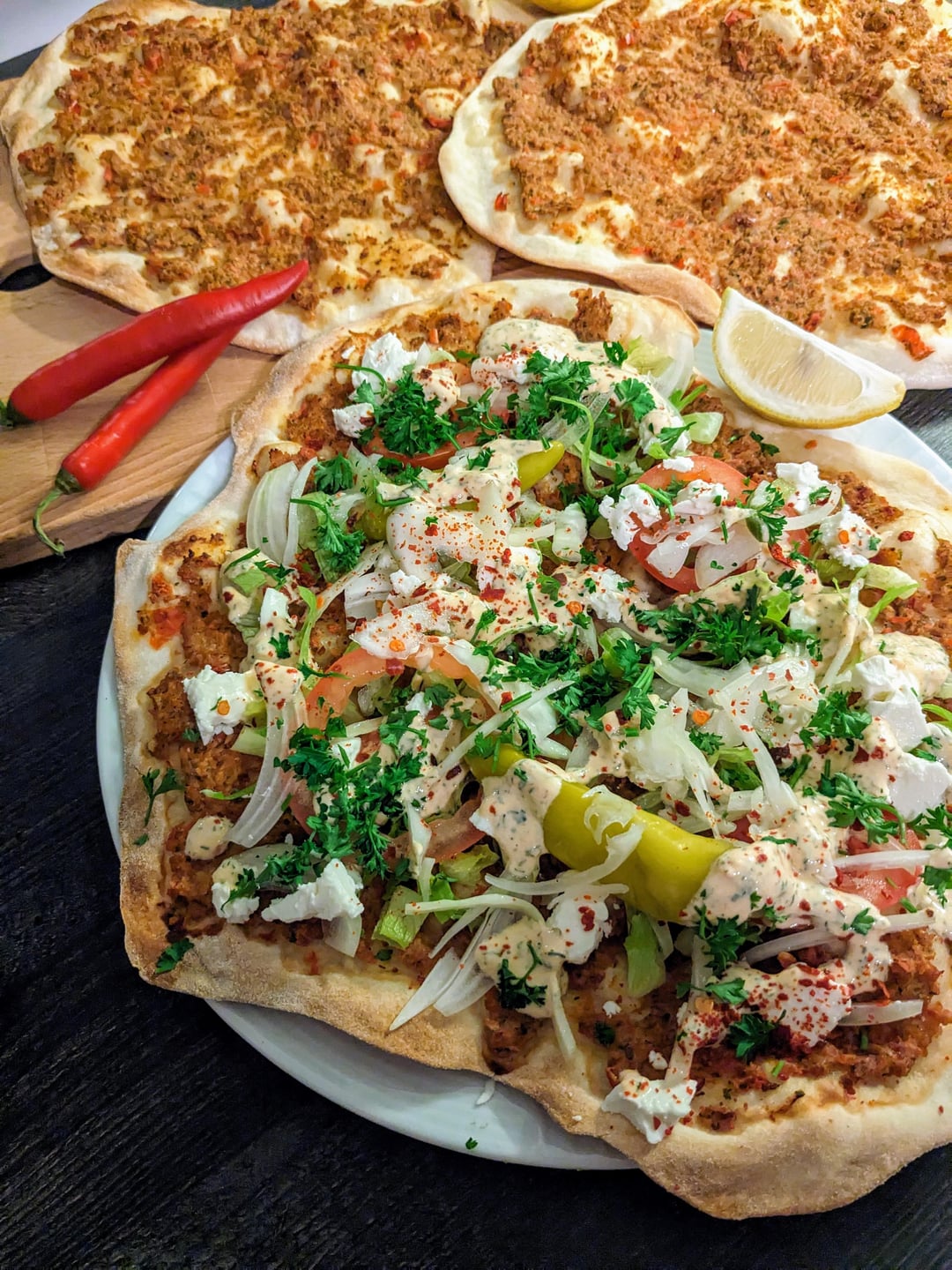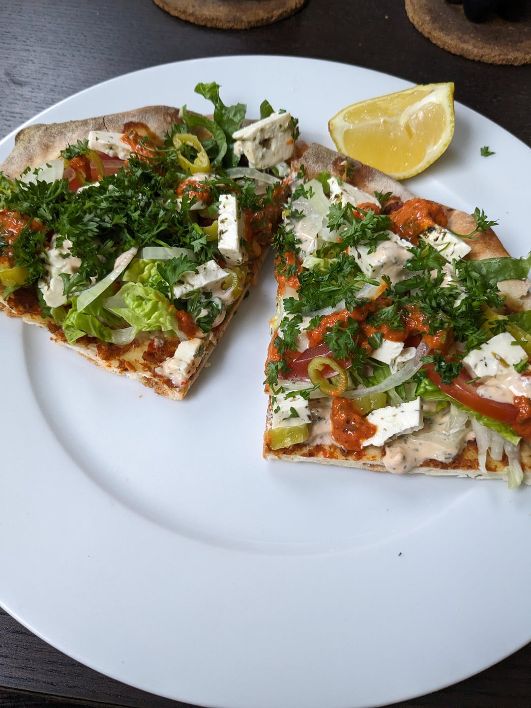Im Ofen gebacken, die Saucen sind ebenfalls selbstgemacht. Leider zu knusprig zum Rollen, großartig war es trotzdem!