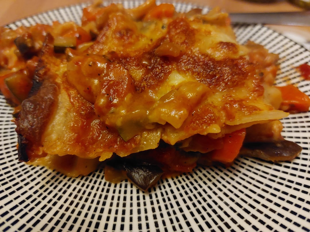 Die war richtig lecker. Mit Aubergine, Karotte, Tomate… weiß nicht mehr was sonst. Dazu Béchamel, Mozzarella und noch etwas Reibekäse. Deliziös!