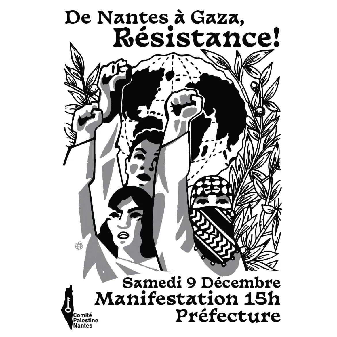 Soutient au peuple Palestinien, contre la mise en place d’un génocide, contre les bombardements et le massacre en cours, pour la libération de tous les otages : de Nantes à Gaza, Résistance ! Rdv Samedi 9 décembre devant la préfecture, 15h.
