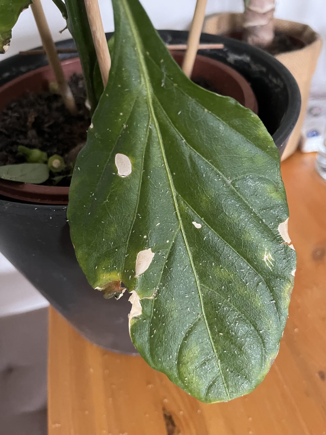 Das sind Blattläuse. Die weißen Stippen auf den großen Blättern sind deren Hautüberreste, da diese wachsen und sich dann regelmäßig häuten.