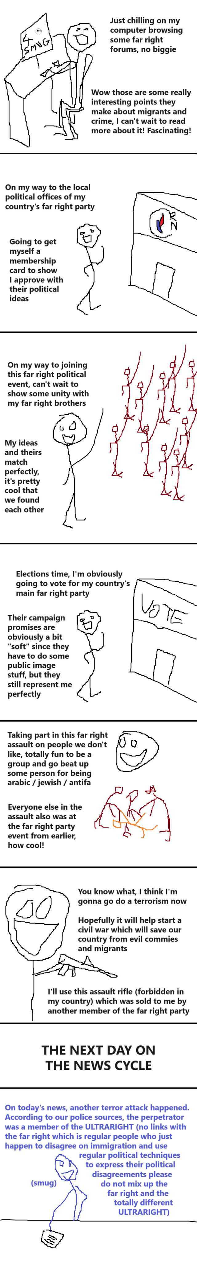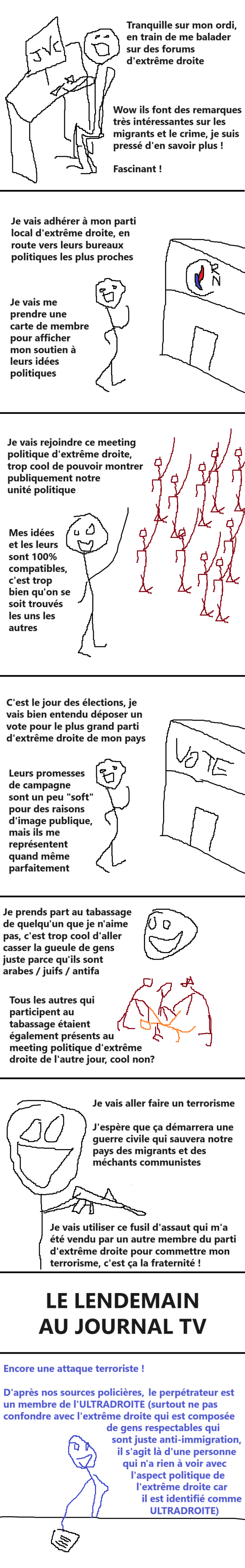 Côté médias, ça y est, [ça ne parle plus que d’ultradroite](https://news.google.com/search?q=ultradroite&hl=fr&gl=FR&ceid=FR%3Afr) pour discuter des actes violents d’extrême droite. Est-ce qu’ils sont au courant que quand l’extrême droite arrive au pouvoir, la presse sont parmi les premiers à se faire contrôler ou dégager ?
