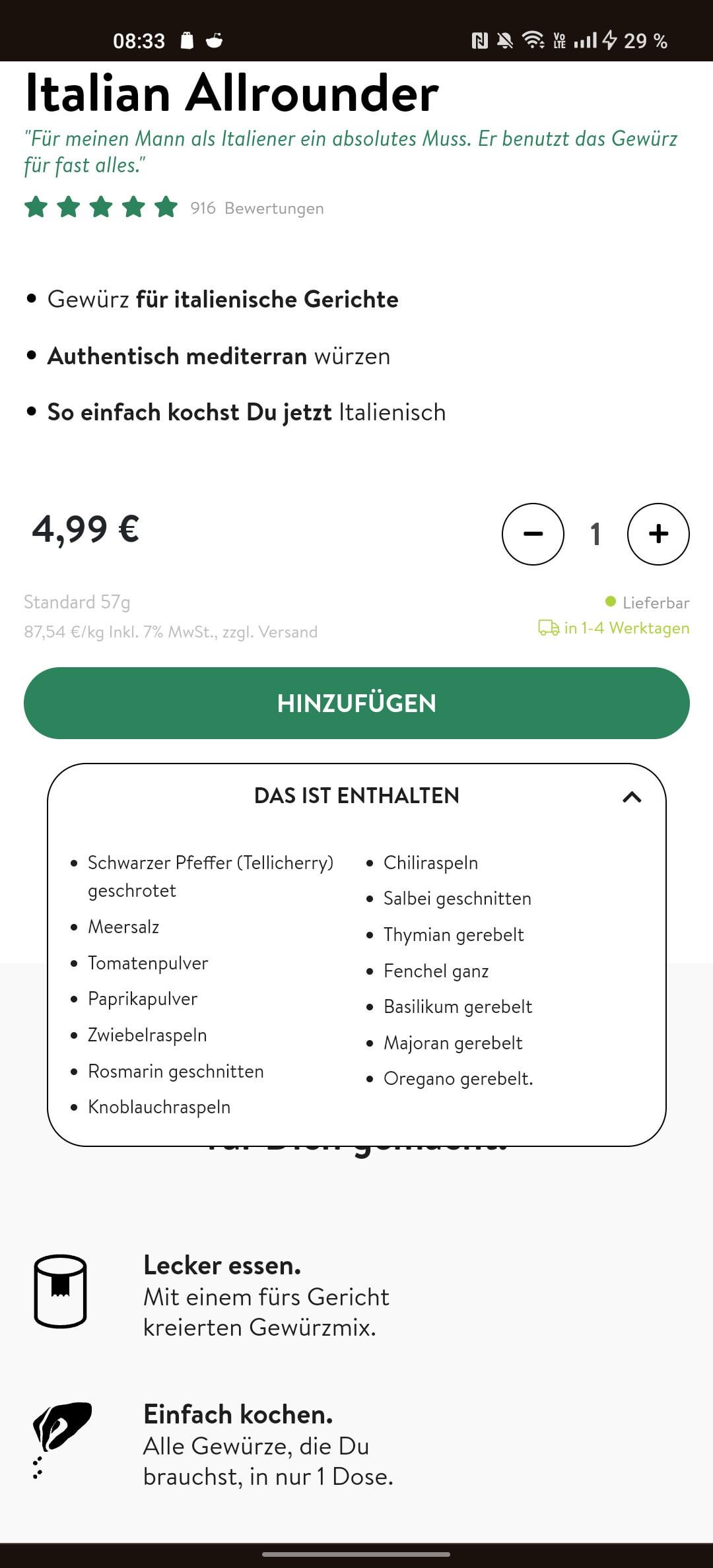 Ich hatte diese Gewürzmischung und kann sie empfehlen. Ein sehr sehr sehr ähnliches Produkt bekommst du bei REWE als “Italian Mammamia” für 1,99€. Auch das geht vollkommen in Ordnung,erinnert sehr stark an ein Markenprodukt.