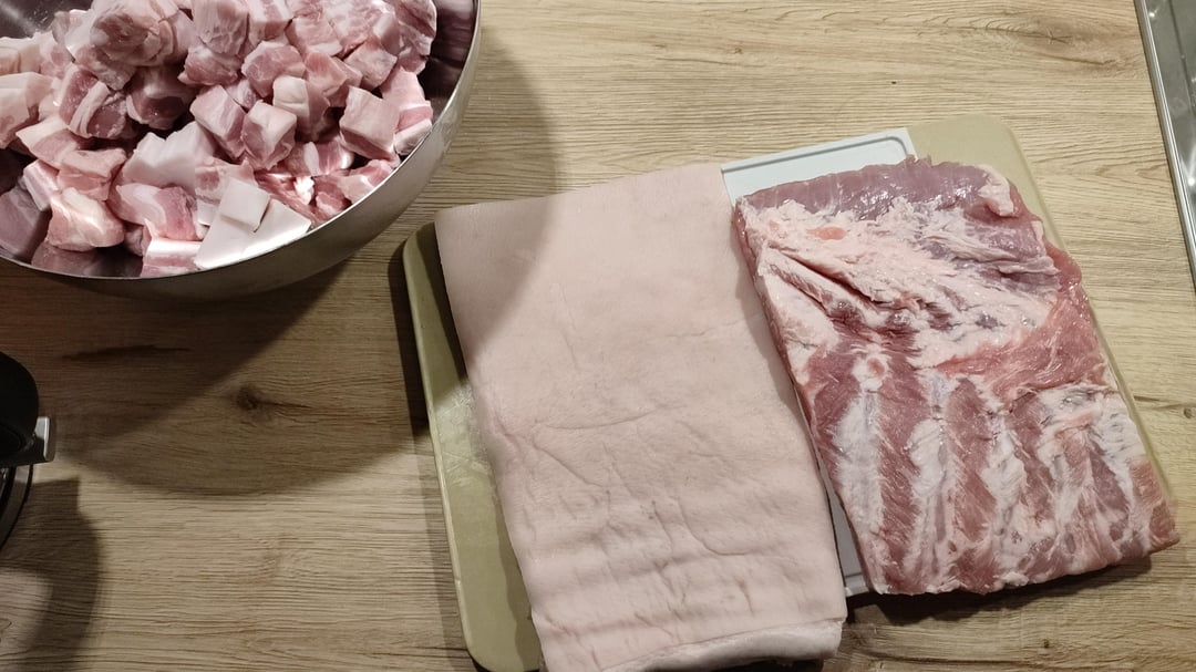 Schweinebauch von der Schwarte getrennt und die Bauchrippen abgelöst. Nicht perfekt, aber für den privaten Gebrauch ok. Rippen und Schwarte machen wir im Ofen und vergenusswurzeln die dann 🙂