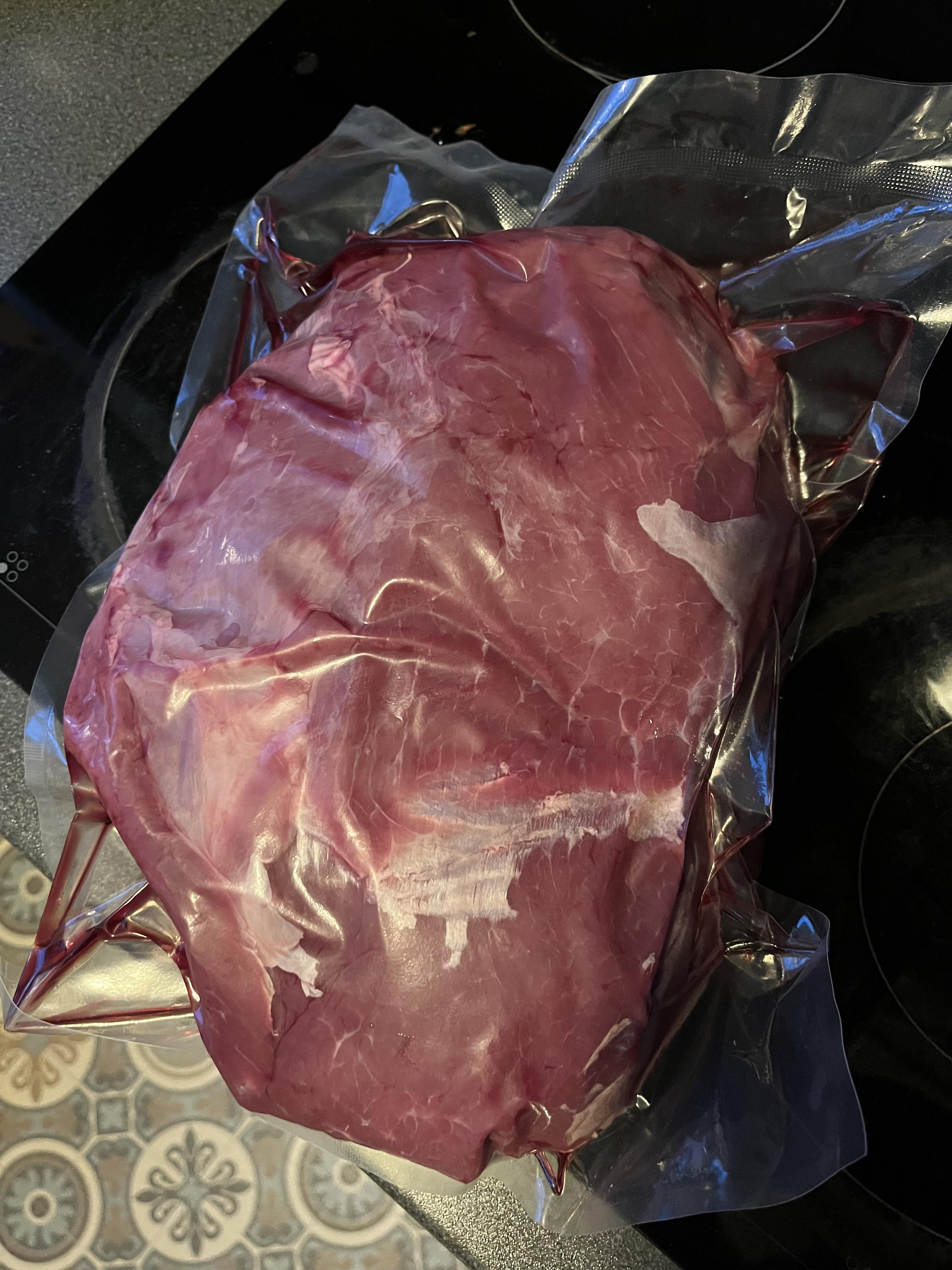 Für den 24. habe ich eben dieses 3kg Stück eines regionalen Erzeugers abgeholt. Es ist aus der Hüfte geschnitten. Mein Plan war es im Sous-vide Bad bei 58 Grad gute 24h zu garen und dann kurz in den Backofen bei 250 Grad. Also Richtund medium.