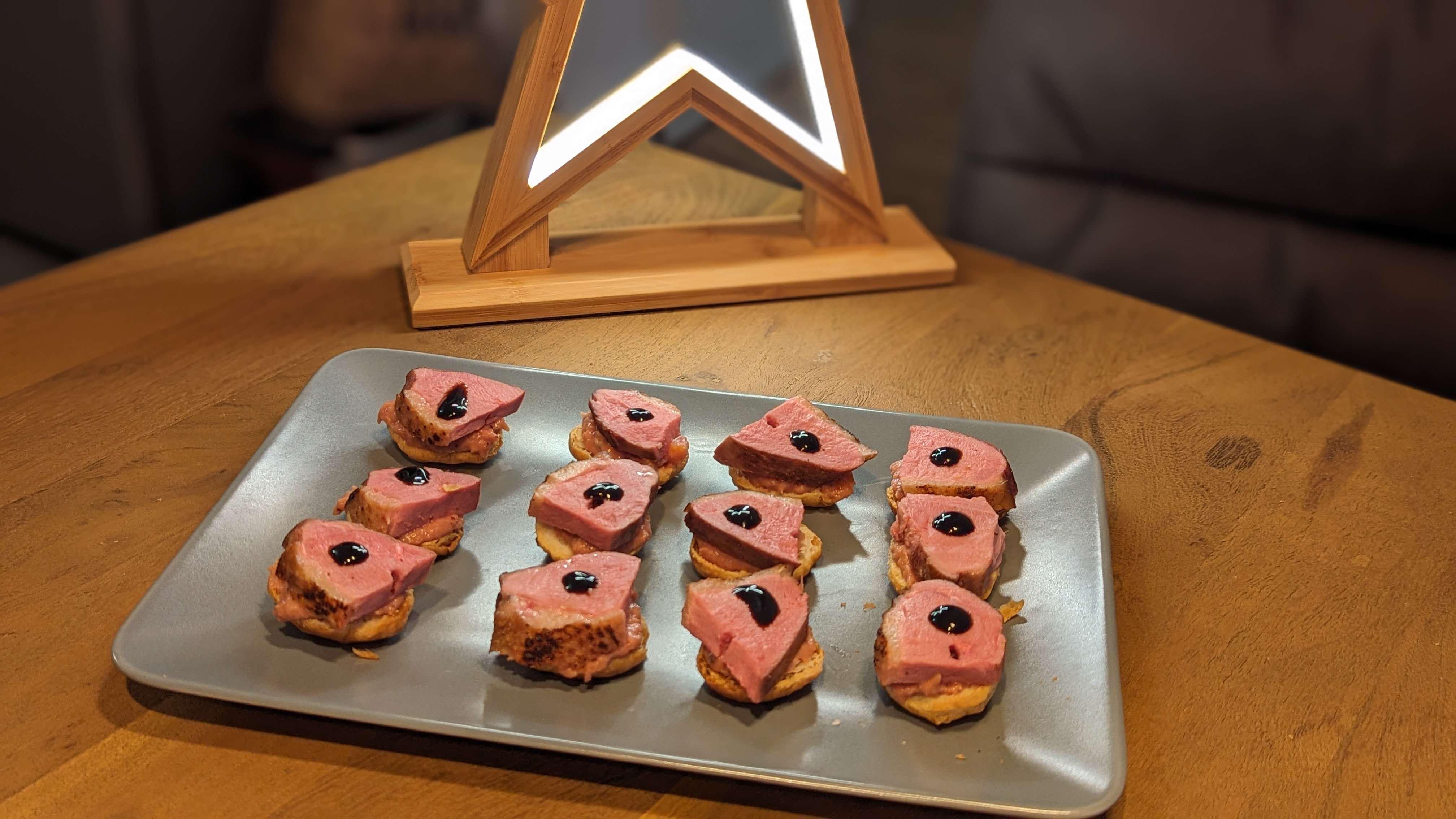 Entenbrust erst scharf angebraten, dann mit Meater (daher die Löcher) auf 65°C Zieltemperatur in der Heißluftfriteuse (meine ist immer so 10-15° heißer als sie behauptet, daher auf 65° gestellt, etwa eine Stunde drin) gegart, Blätterteig gekauft, ausgestochen mit einem Glas und dann nach dem Backen halbiert (wurden recht kugelig)