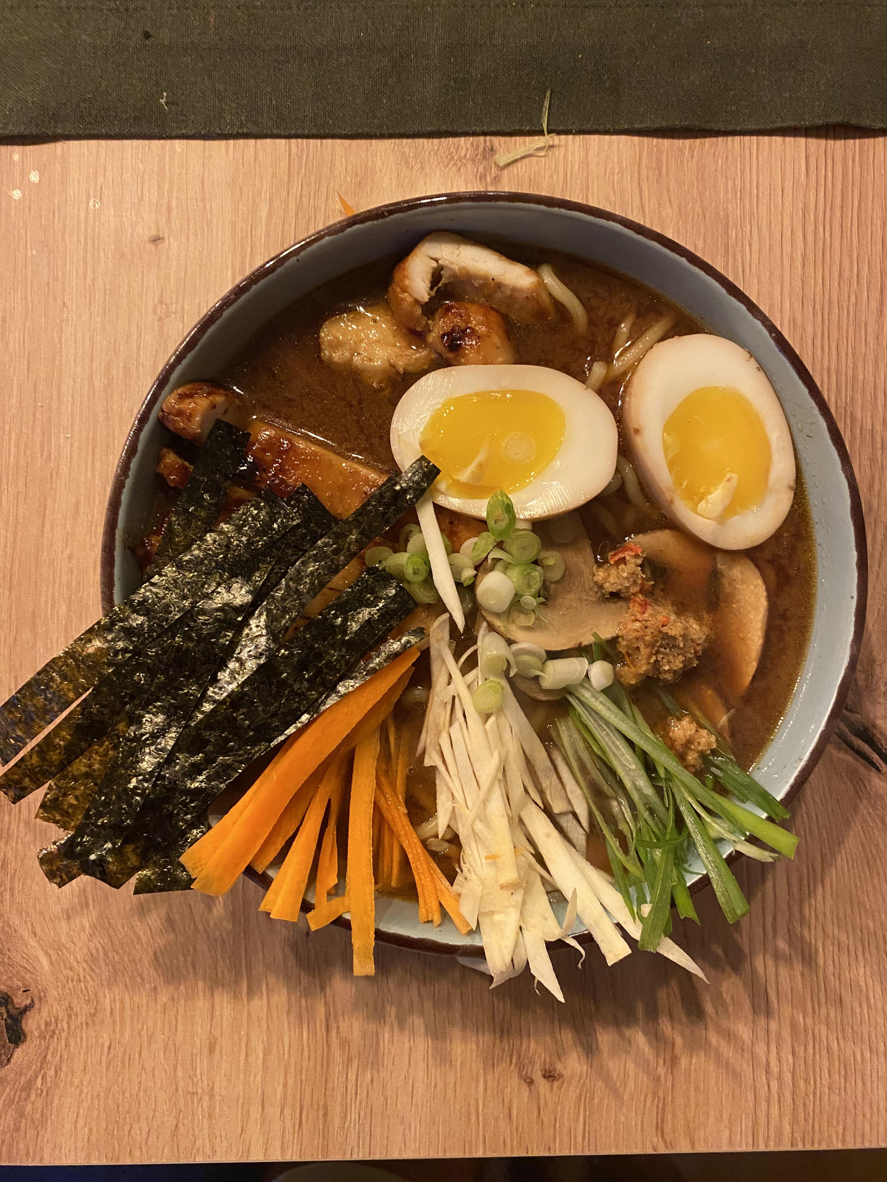Eier 6 min kochen, dann im kalten Wasser abschrecken und abkühlen lassen. Sojasoße und Sake (1:1) mit Knoblauch und Inger kurz aufkochen. Die geschälten Eier mit der Marinade in einen Topf geben, und mit warmen Wasser auffüllen. Die Eier für min 12h marinieren lassen.