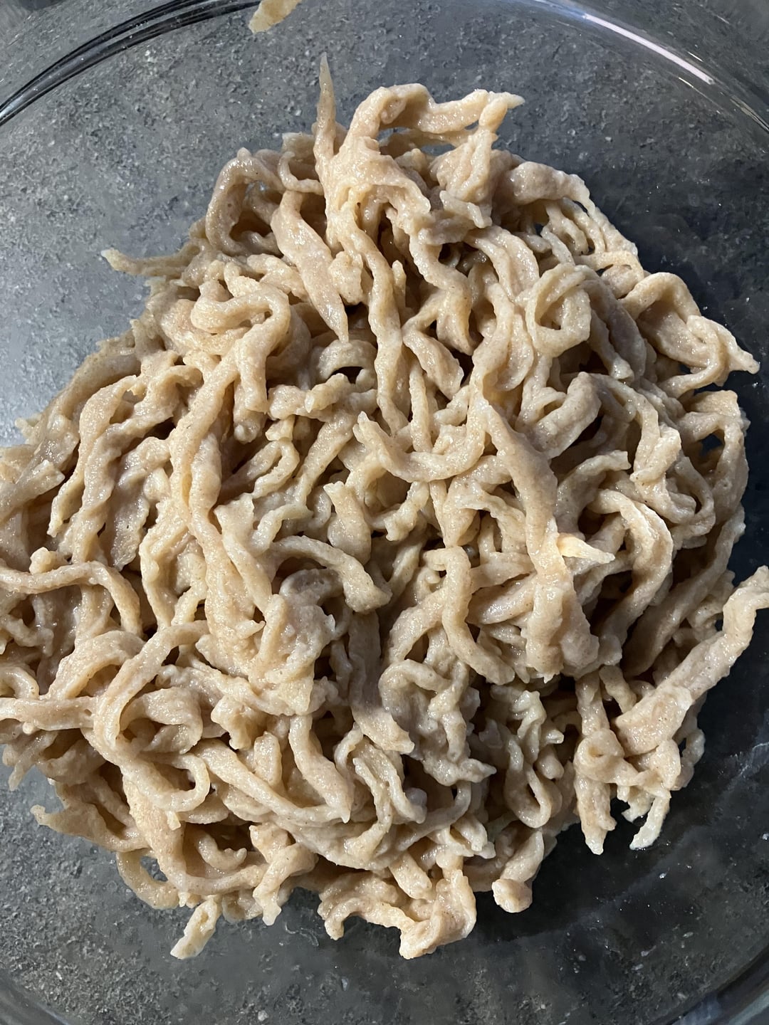 Spätzle: 100 g 1050 Mehl, 130 g Vollkornmehl, 1 Ei, Prise Salz, 200 ml Wasser