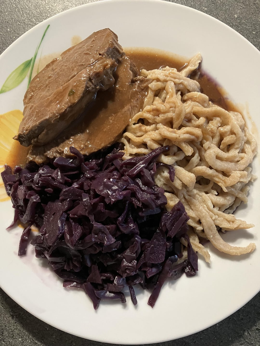 Rehbraten: scharf angebraten dann zusammen mit angedünsteten Zwiebel und Suppengrün, passierten Tomaten, Rotwein, gemüsebrühe Sojasoße im Ofen für 3 Stunden bei 120 Grad
