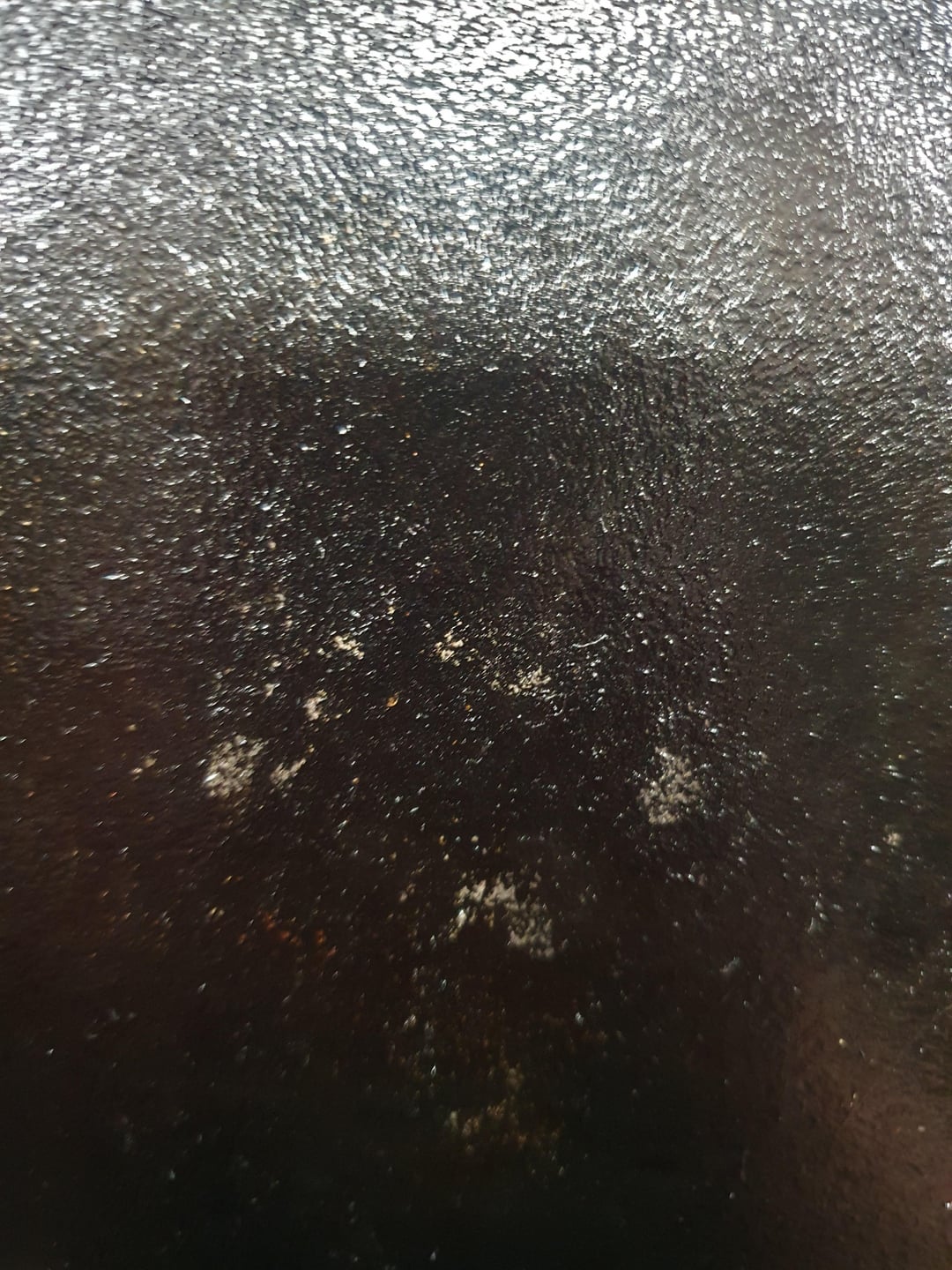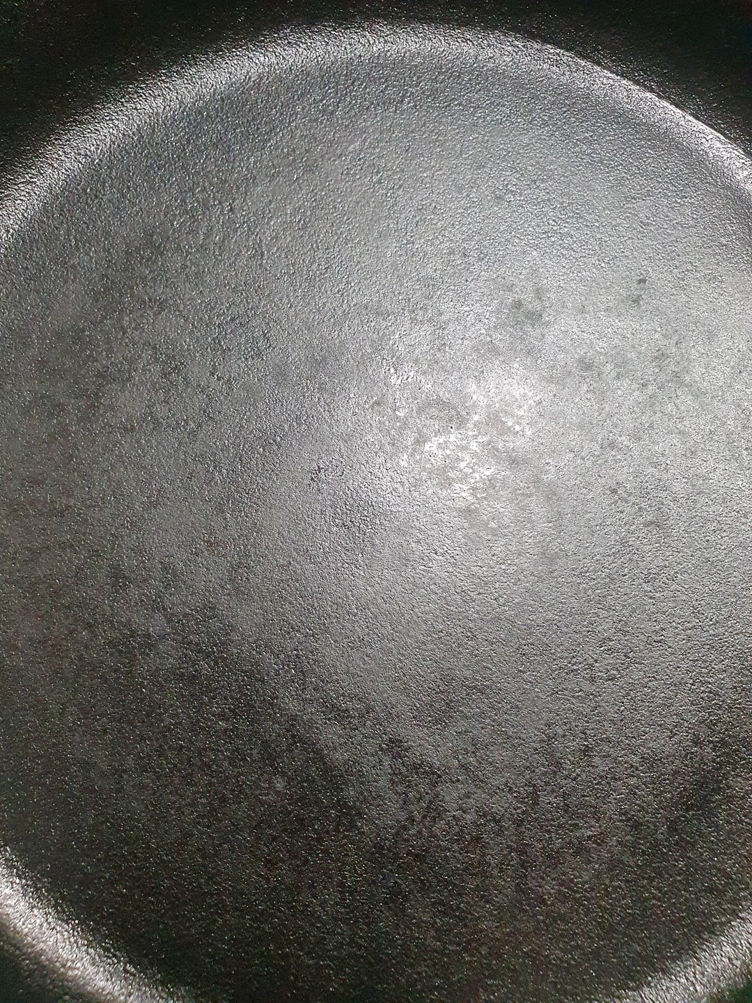 Hier fiel mir schon auf, dass in der Mitte der Pfanne wenige Stellen bräunlicher erschienen statt satt schwarz.