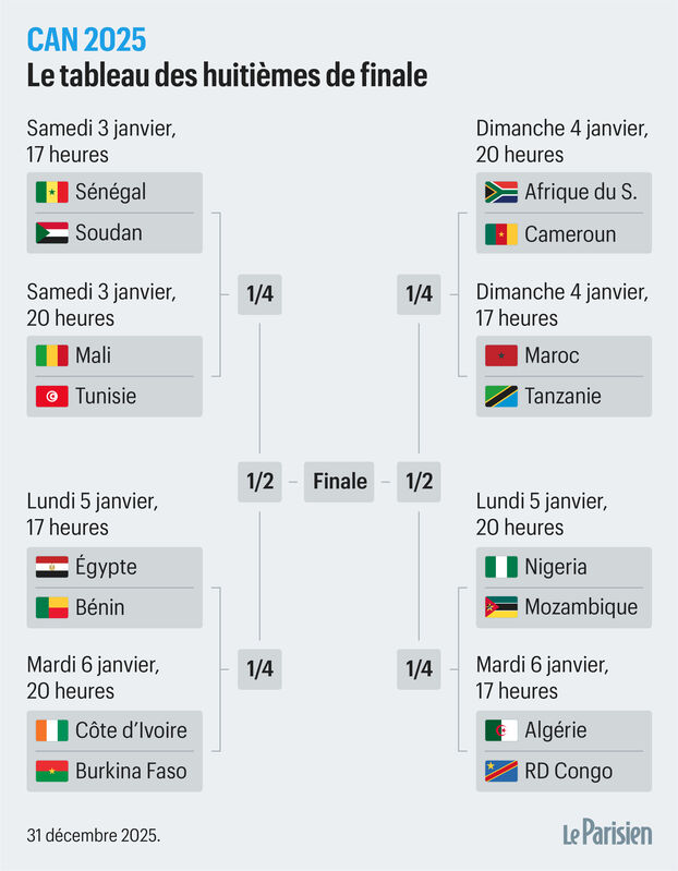 Au programme, des affiches de très haut niveau dès les 8es de finale. Étalés sur quatre jours, ces derniers verront plusieurs pays de premier plan croiser le fer, à l’image du choc entre l’Algérie et la République démocratique du Congo, prévu le mardi 6 janvier à 17 heures. Le Maroc et le Sénégal, grands favoris de la compétition, ont de leur côté été épargnés puisqu’ils retrouveront deux nations ayant terminé parmi les meilleurs troisièmes. Les Lions de l’Atlas défieront la Tanzanie le dimanche 4 janvier à 17 heures, tandis que Sadio Mané et ses partenaires feront face au Soudan en ouverture, le samedi 3 janvier à 17 heures.